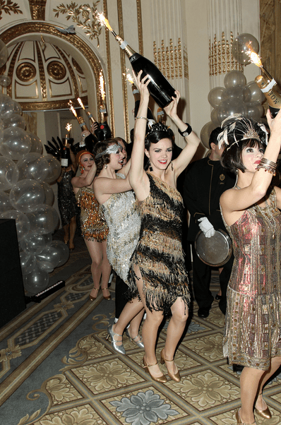 The glamour of The Great Gatsby was brought to life as the stars, producers and nearly 700 guests straight out of Gatsby’s mansion, including Leonardo DiCaprio, Jay-Z, Carey Mulligan, Tobey Macguire, Isla Fisher, Jake Gyllenhaal and director Baz Luhrmann all partied with Moët & Chandon at the after party at The Plaza Hotel. Leonardo was the first of the cast to arrive, causing a stir throughout the lobby as guests clamored for glasses of Moët & Chandon Imperial from a soaring Moët champagne tower, complete with a Gatsby flapper dancing on top holding an oversized bottle of Moët 1921 champagne. Stepping off the elevator, Leo gasped, “Wow!,” when he saw how his director,Baz Luhrmann, had transformed the iconic Plaza hotel into Gatsby’s mansion, pausing to admire the glowing Moët champagne tower before being ushered inside. Gatsby star Carey Mulligan and Jake Gyllenhaal arrived together shortly after Leo, along with Carey’s husband, Marcus Mumford of Mumford & Sons.