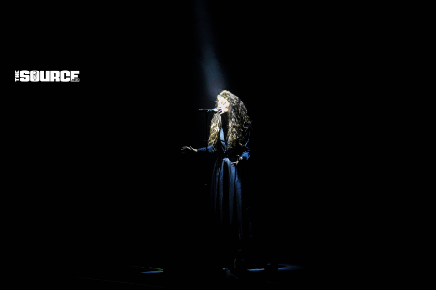 A simple black curtain served as the backdrop, and a chandelier hung over the center of the stage. The black veil lifted and Lorde’s band appeared, consisting of a powerhouse drummer and keyboardist. She performed “Biting Down.” Strobe lights flashed on the drums to the beat and the stage turned purple.