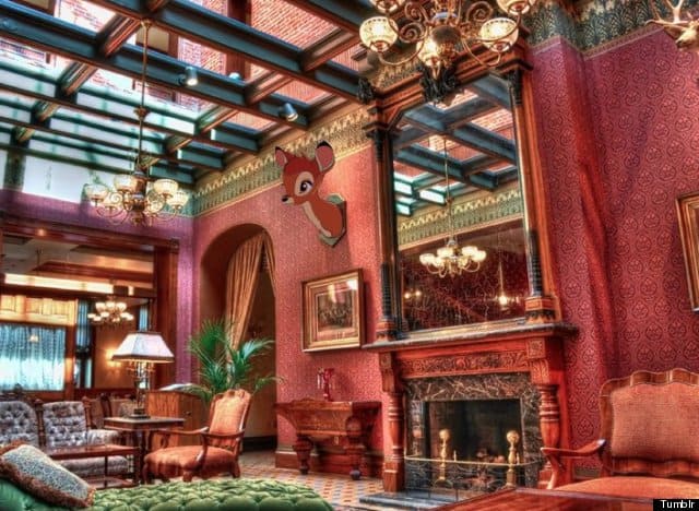 “The idea just popped in my head to put Disney princesses into environments that they wouldn’t be associated with,” the New York City artist told the Huffington Post. The collection features a gaunt Alice (from Alice in Wonderland) superimposed over a sketchy city alley, Ariel (from The Little Mermaid) crawling to shore to escape the oil-contaminated ocean, the ‘100 acre woods’ that Pooh calls home loses a few acres to deforestation, and Bambi as a taxidermy wall decoration.