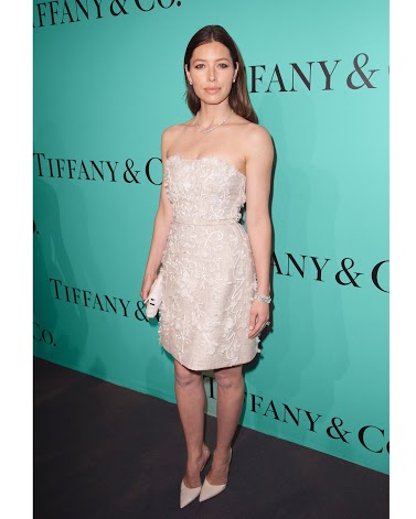 In honor of the occasion, Biel paired her Giambattista Valli strapless dress with gorgeous Tiffany & Co. diamonds, including Solitaire Round Diamond Stud Earrings in platinum, the Tiffany Victoria Diamond Necklace in platinum, the Tiffany Jazz three-row diamond bracelet in platinum and the Three Row Emerald Cut Diamond Bracelet in platinum.