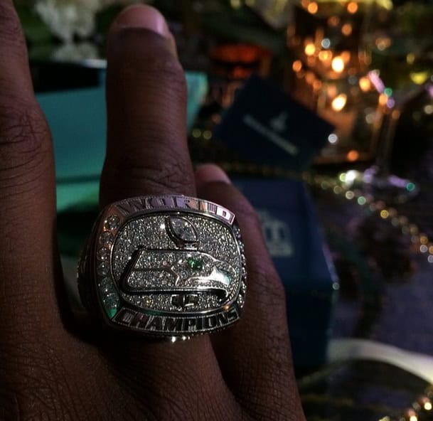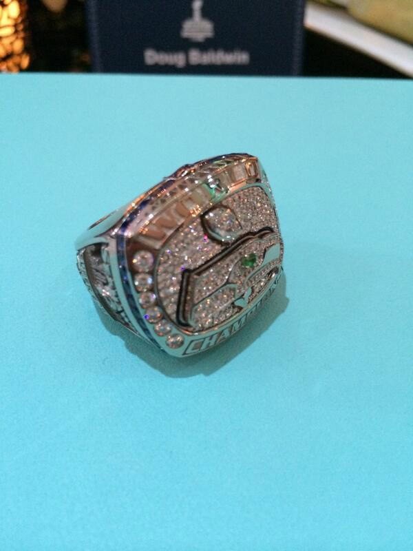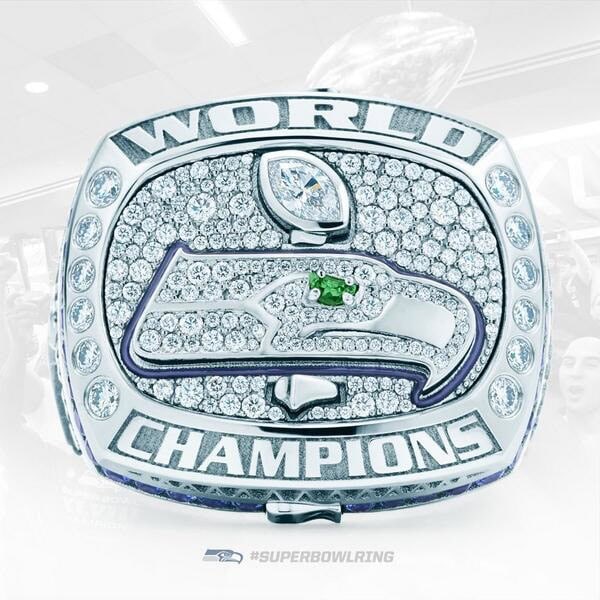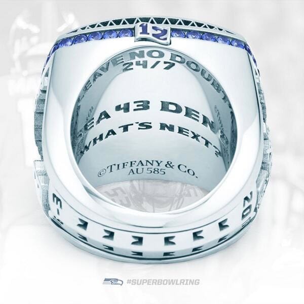 The Seahawks unveiled their championship rings at a ceremony in downtown Seattle on Thursday. Designed by Tiffany & Co., the white gold ring features a “three-dimensional Seahawks logo of 64 round diamonds with a vibrant emerald hue,” according to the team. Forty blue sapphires surround the ring top flanked by two “12” flags, referring to Seattle’s “12th man,” the nickname of the club’s raucous fan base.