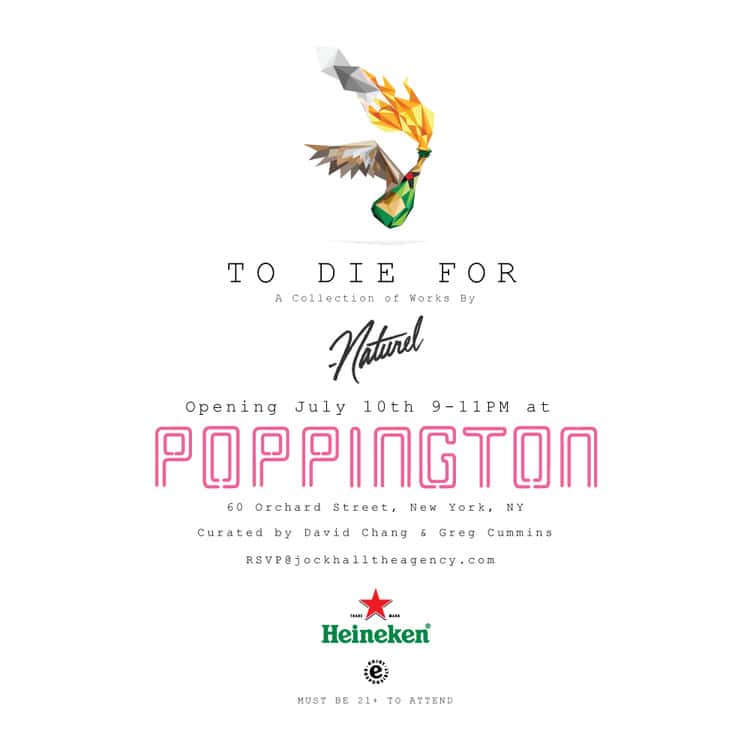 Now, Naturel will open a month long exhibition of his latest work in a collection entitled “To Die For”, at Dame Dash‘s Poppington art gallery in NYC. The exhibition, which was curated by David Chang and Greg Cummins begins today (July 10) and will go on until August 1. The opening begins at 9 PM and is sponsored by Heineken.