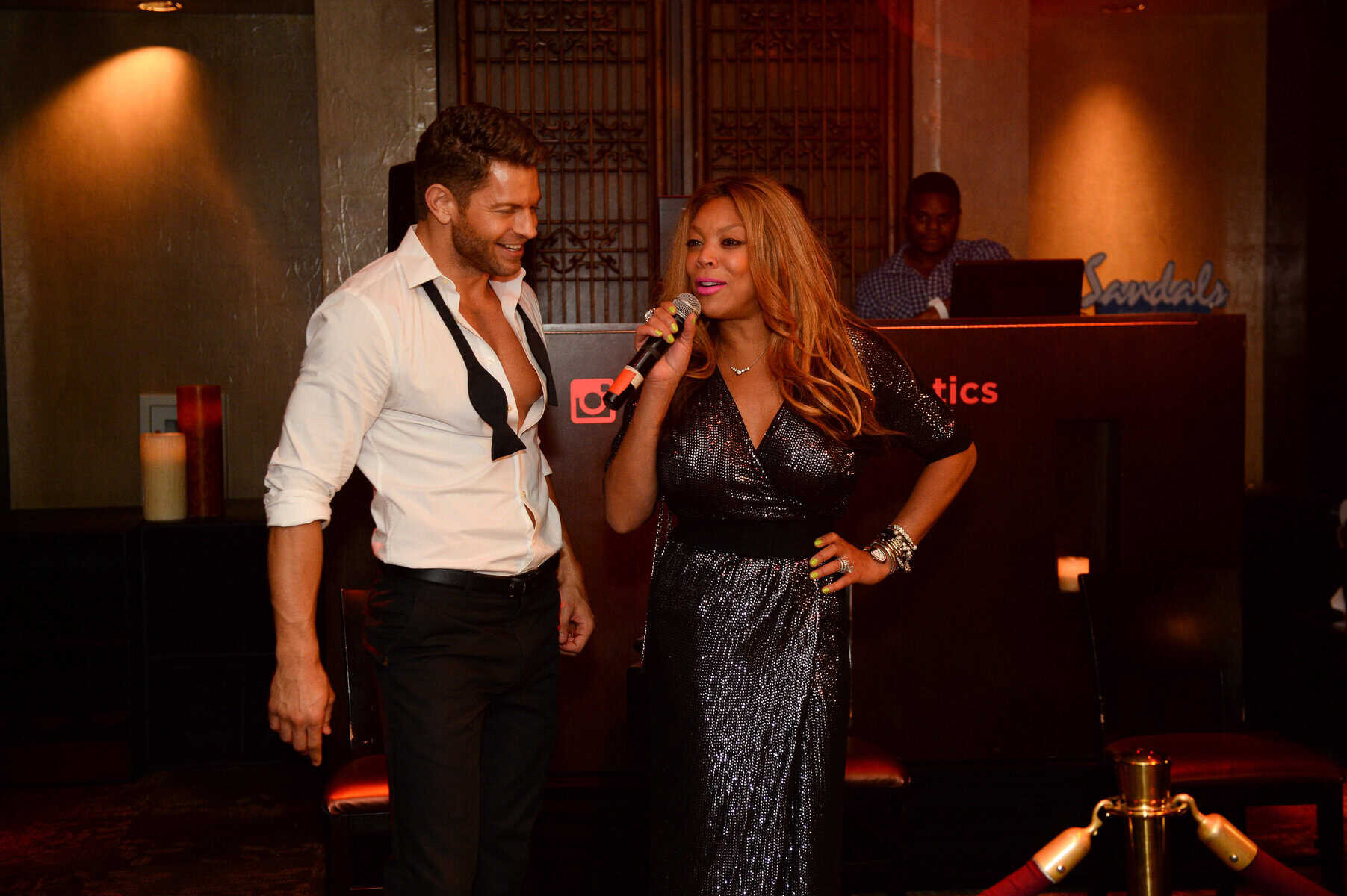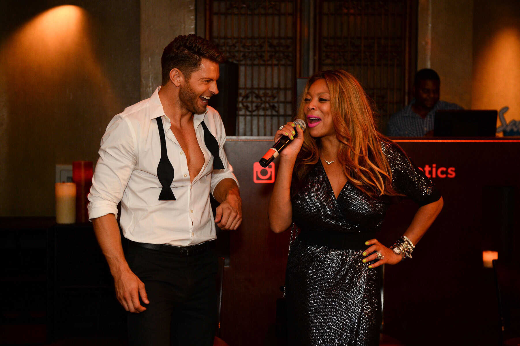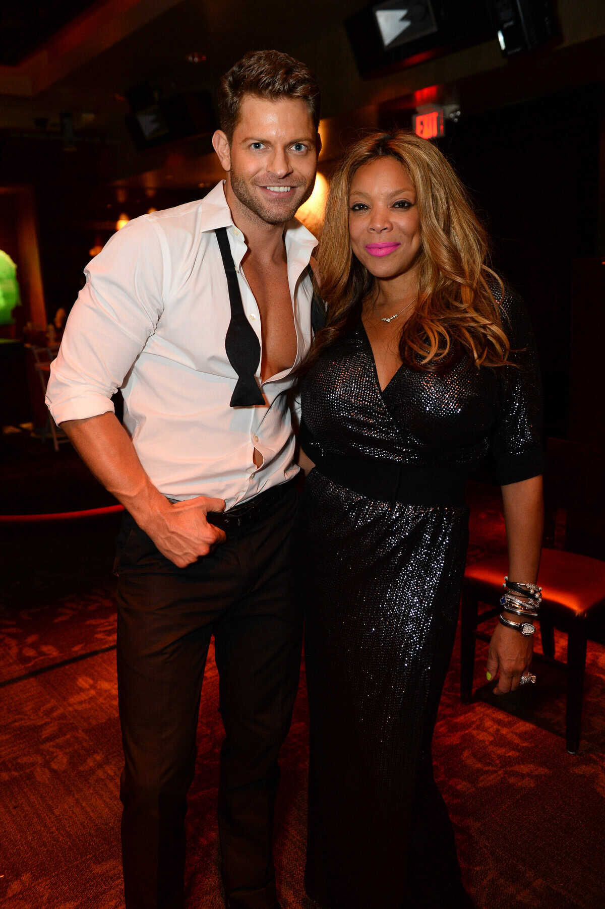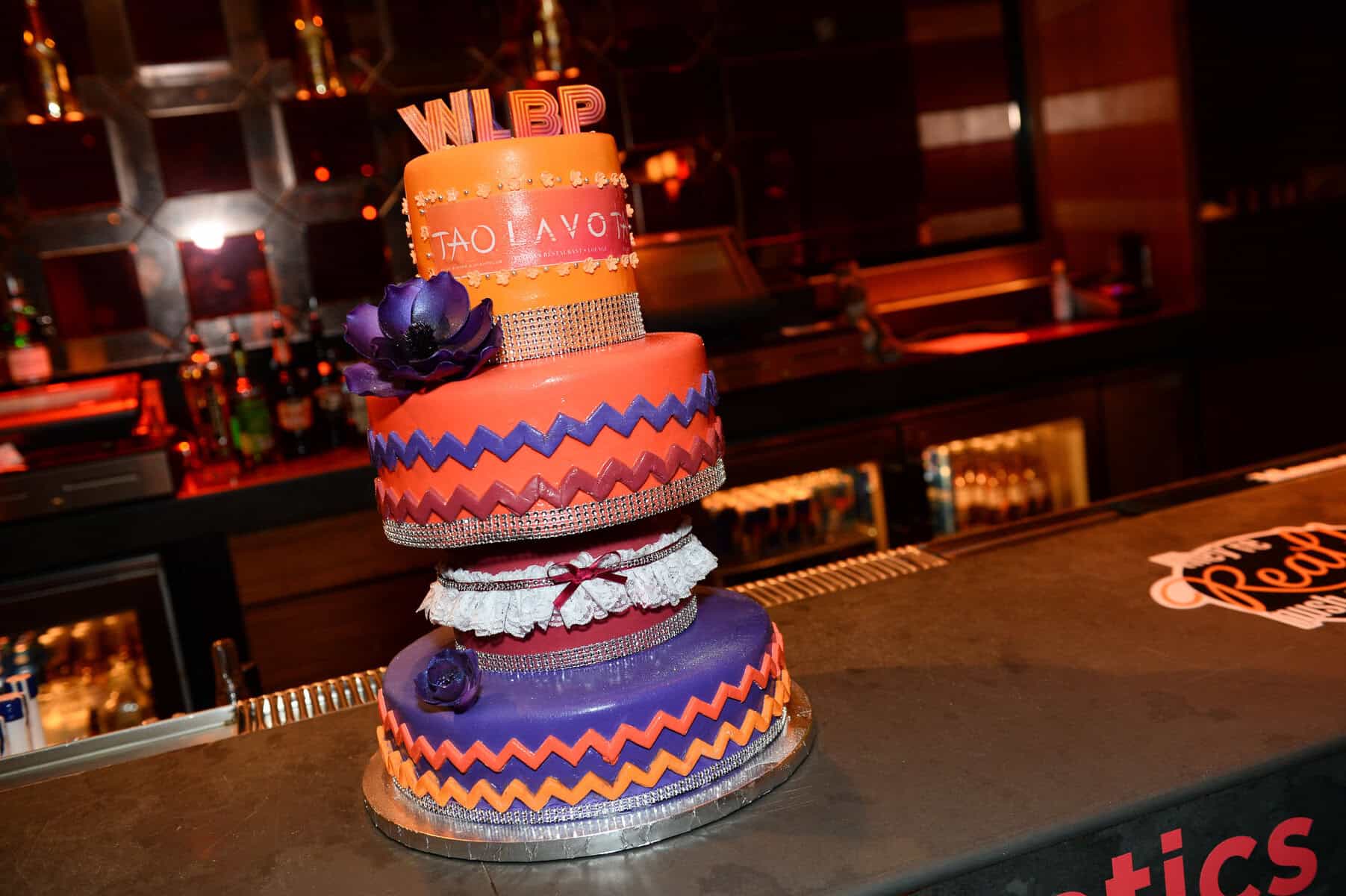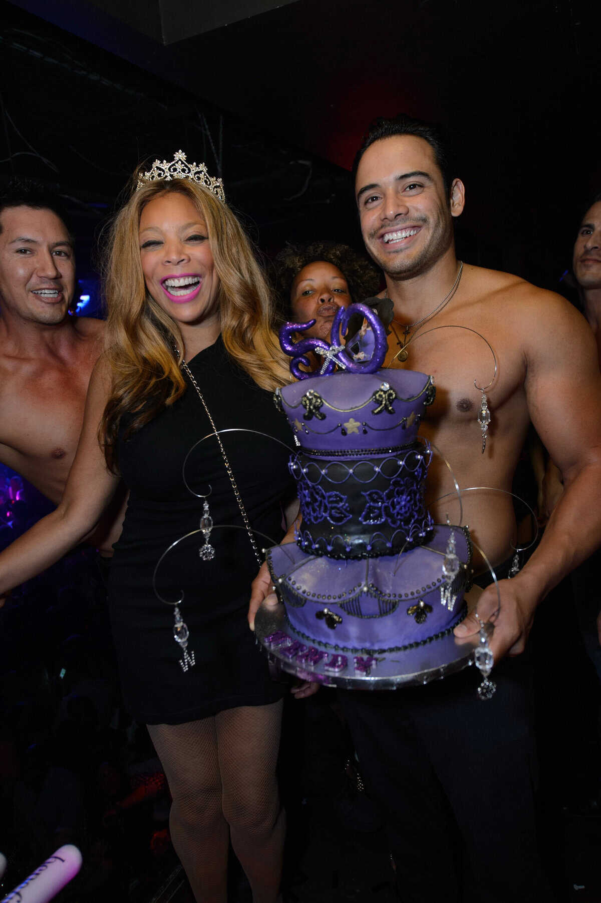 After dinner, the group took over a VIP skybox at TAO Nightclub to celebrate Williams’ 50th birthday. Shortly after she arrived, the TV personality was surprised with another custom birthday cake, which was presented to her by the Chippendales as well as TAO’s mirror man. Armed with bright pink glow sticks, Williams danced with her husband to the sounds of DJ Ross One and hung close to the railing of her skybox so she could overlook the entire party scene.