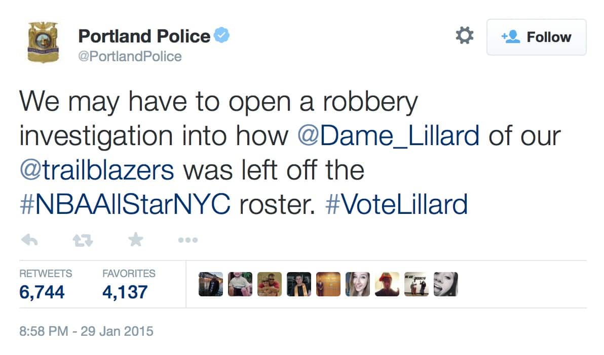 The Portland Police have been known to weigh in on the Trail Blazers before via Twitter. In May 2014, they “endorsed theft” when the Blazers came away with a 122-120 Game 1 win over the Houston Rockets in the first round of the playoffs, and earlier this season, the police gave center Robin Lopez permission to watch Star Wars on his phone while he drove to practice.