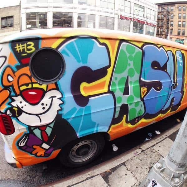 Keeping in the graf tradition of drawing comic characters with his flavorful ups, CASH’s signature is none other than the cool, Chester Cheetah from the Cheetos ads. Definitely pushing up on legendary status, CASH is still active and continues to rep his RFC click. Check out some of his ill hand styles below.