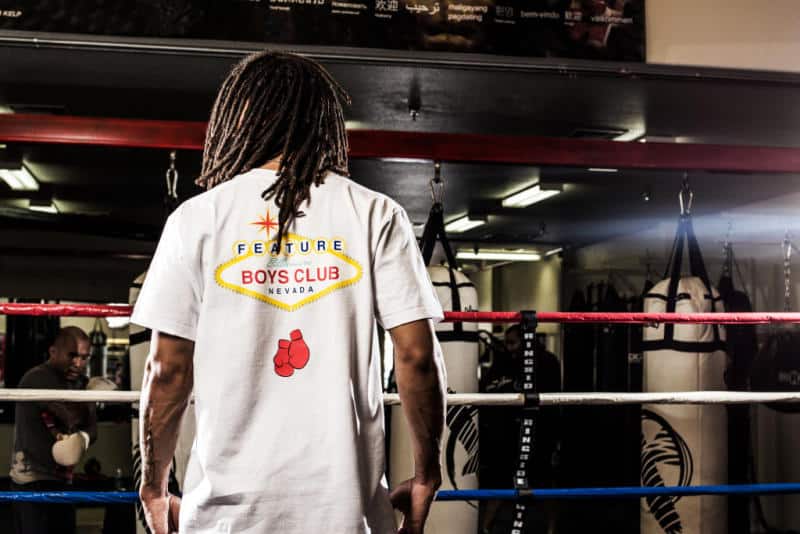 Billionaire Boys Club and Feature have collaborated for the release of limited edition “Fight Of The Century” T-shirts. These shirts were created in honor of the long anticipated boxing match between Floyd Mayweather and Manny Pacquiao. The front of the shirt features the BBC astronaut in a boxing stance with the “Billionaire Boys Club” text faded in the background, while the back of the shirt has text similar to the famous “Welcome to Las Vegas” sign. This collaboration tee is available in black and white colorways and can be purchased for $60 USD at the BBC store and online.