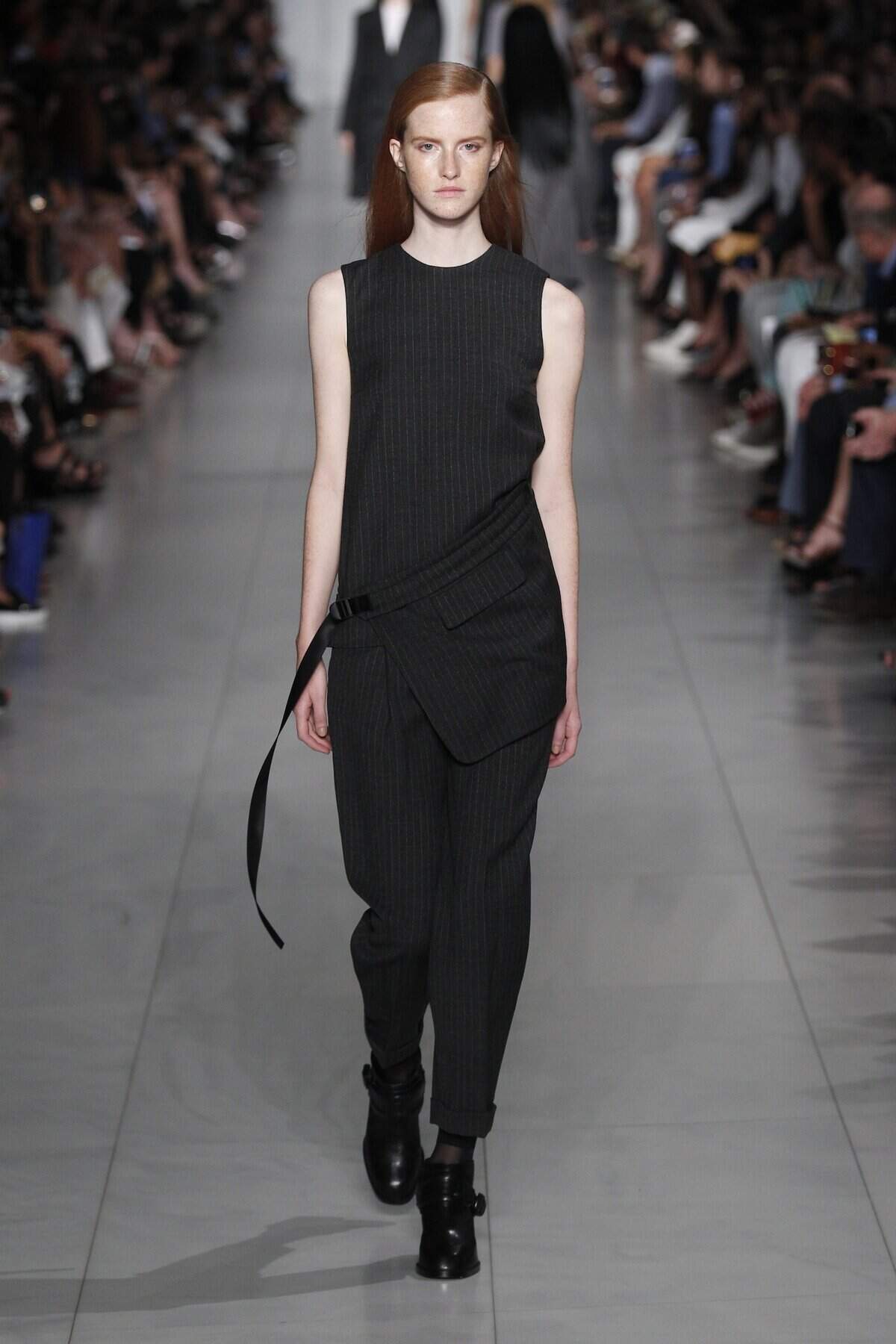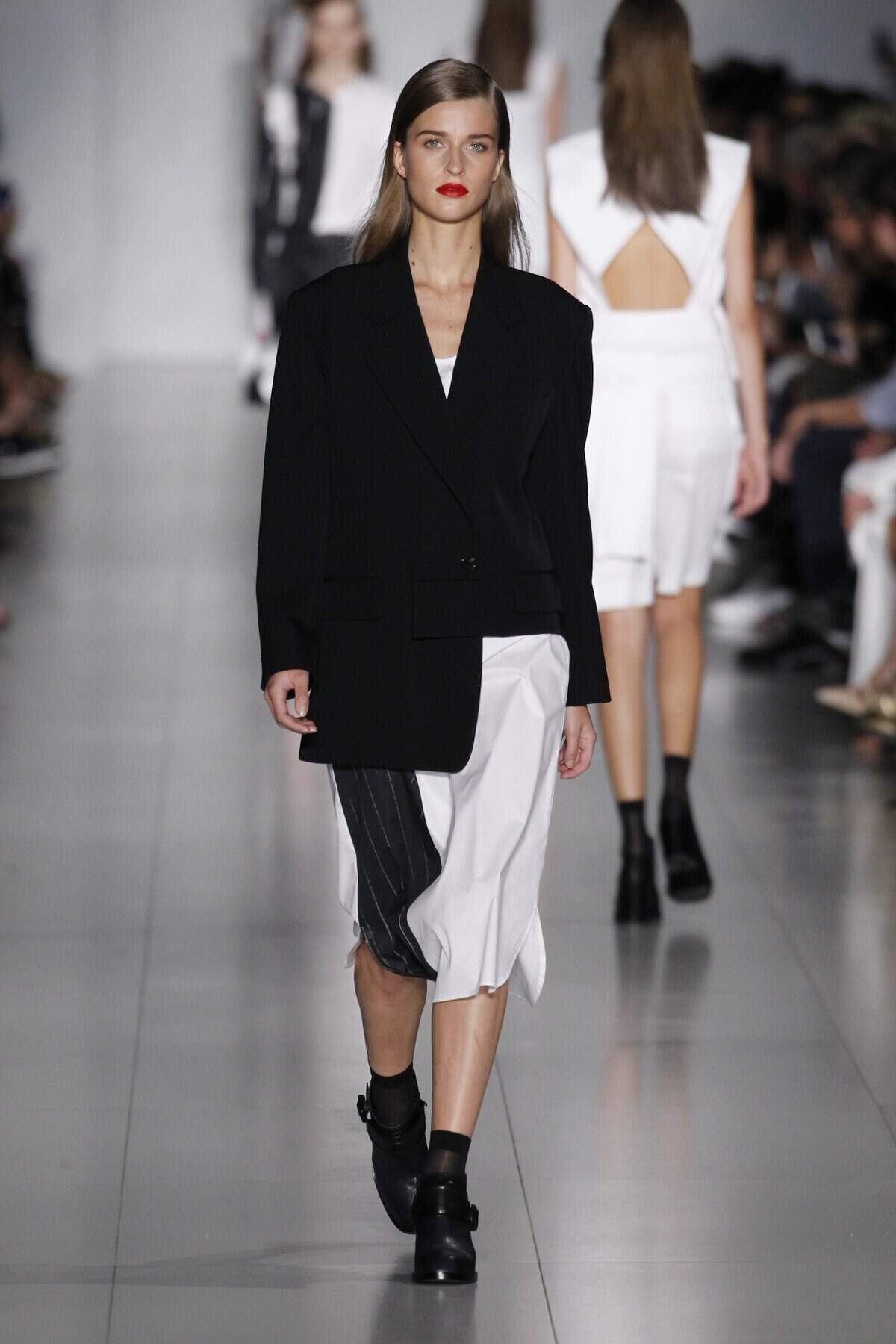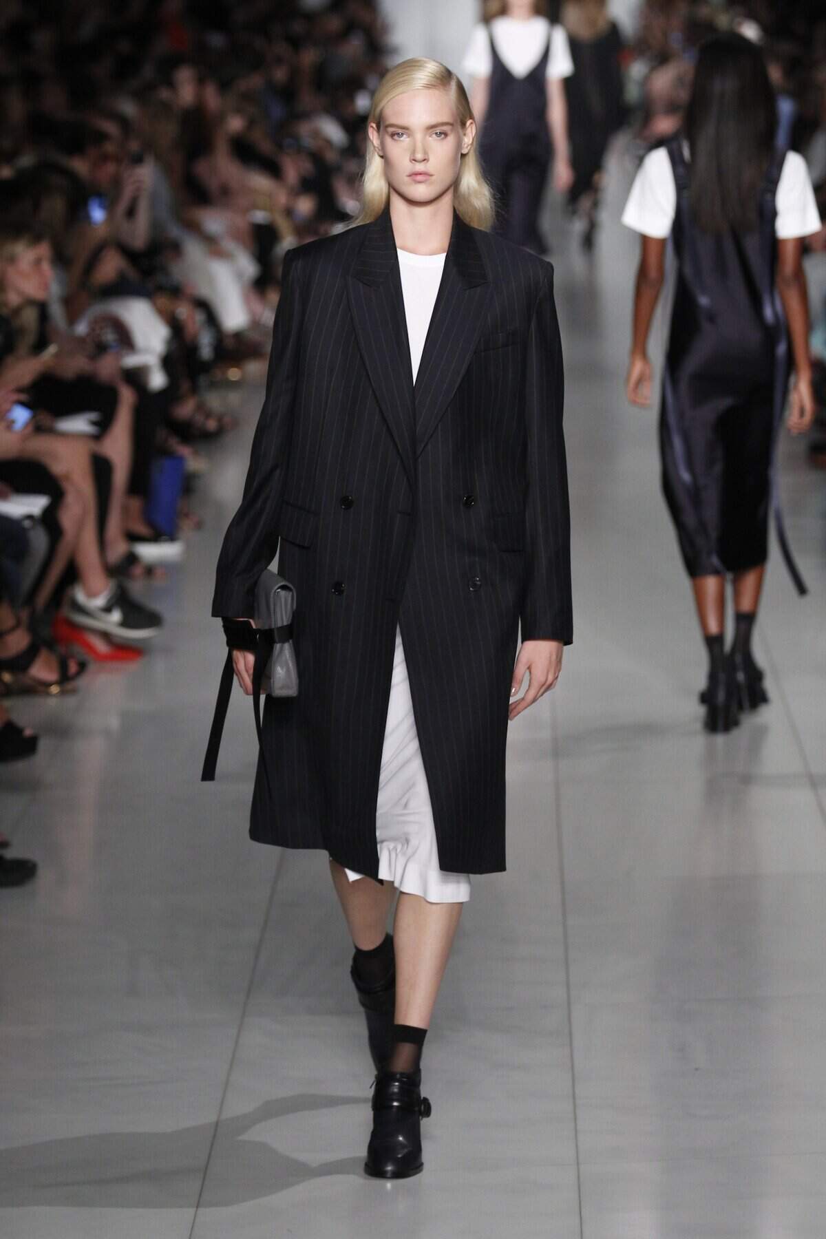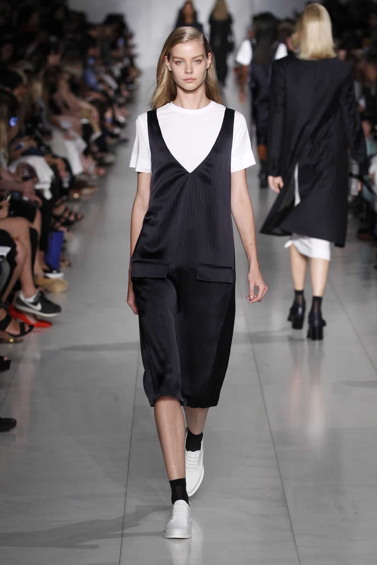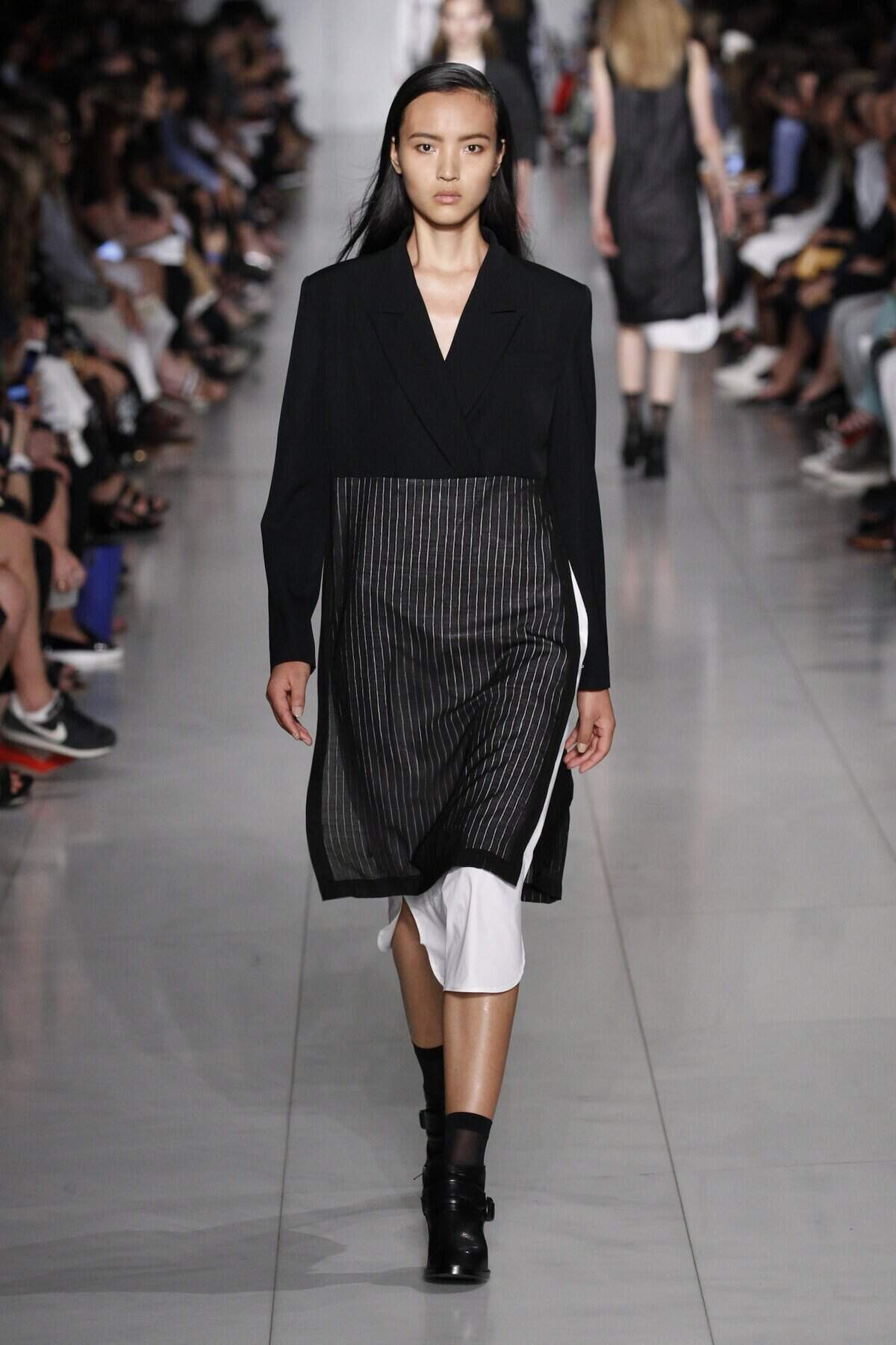 Founded in 1984 by Donna Karan, DKNY saw its first fashion week led by fashion directors other than Karan herself. Westfield World Trade Center West Gallery debuted DKNY’s Spring 2016 RTW collection under co-fashion directors and Public School co-founders Dao-Yi Chow and Maxwell Osborne. The beautifully tailored collection focused on a narrative on corporate America with pinstripes, blazers and a color palette more New York than having a fashion week presentation at a PATH station. Black, white, gray and navy blue were the colors on the runway with a mix of feminine and masculine silhouettes. Asymmetrical design, broad shoulders and large and fitted trench coats were also at play. The cityscape, architecture and essence of New York were heavily present in the collection which reflected the construction of the city.