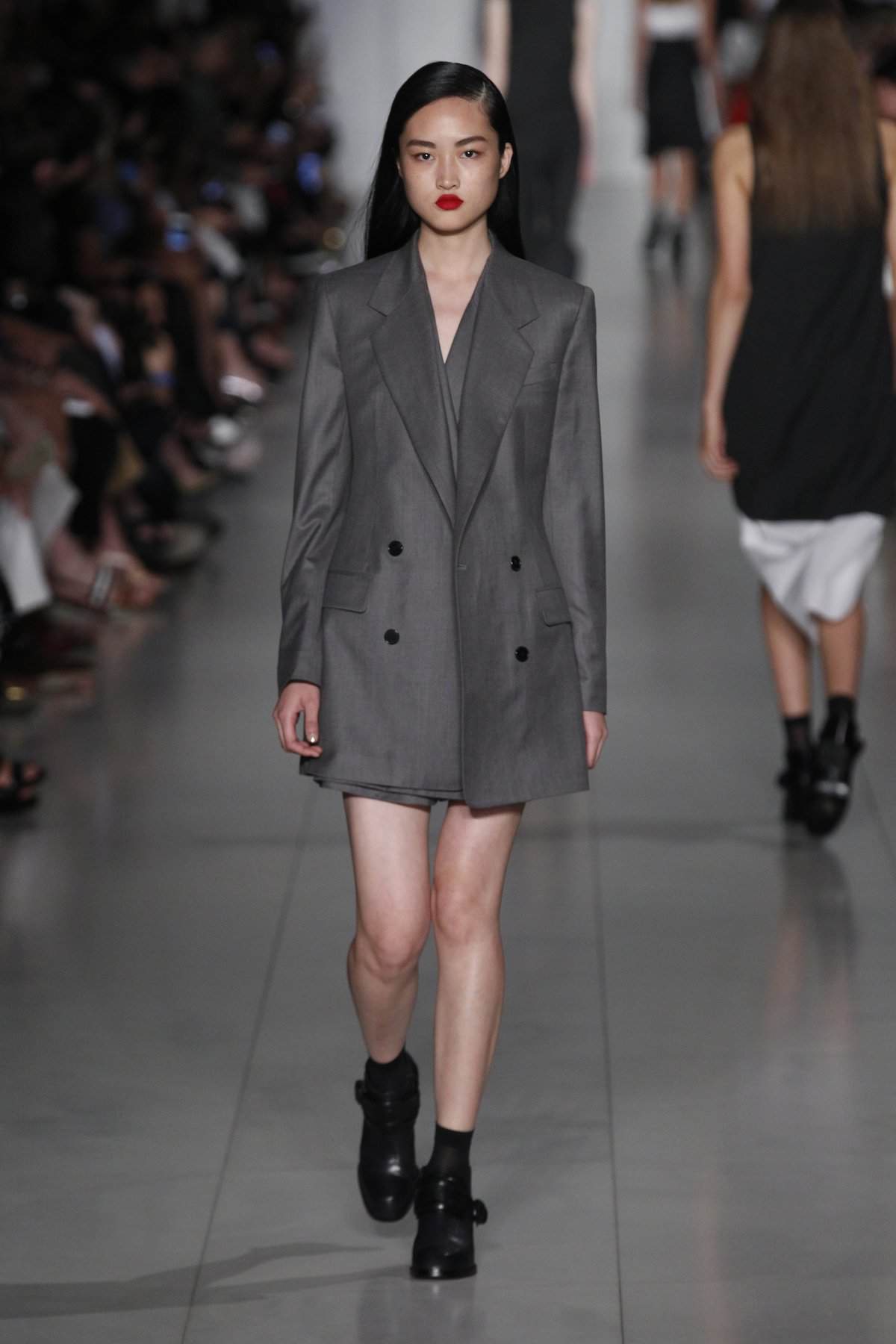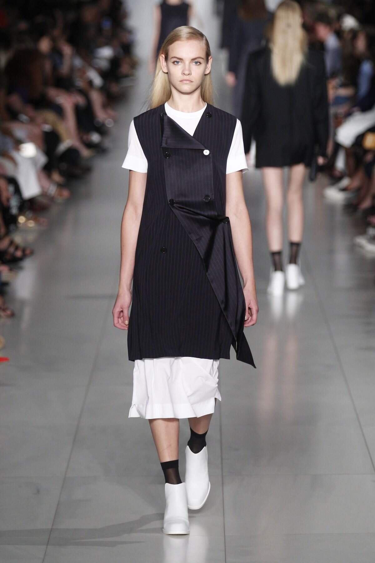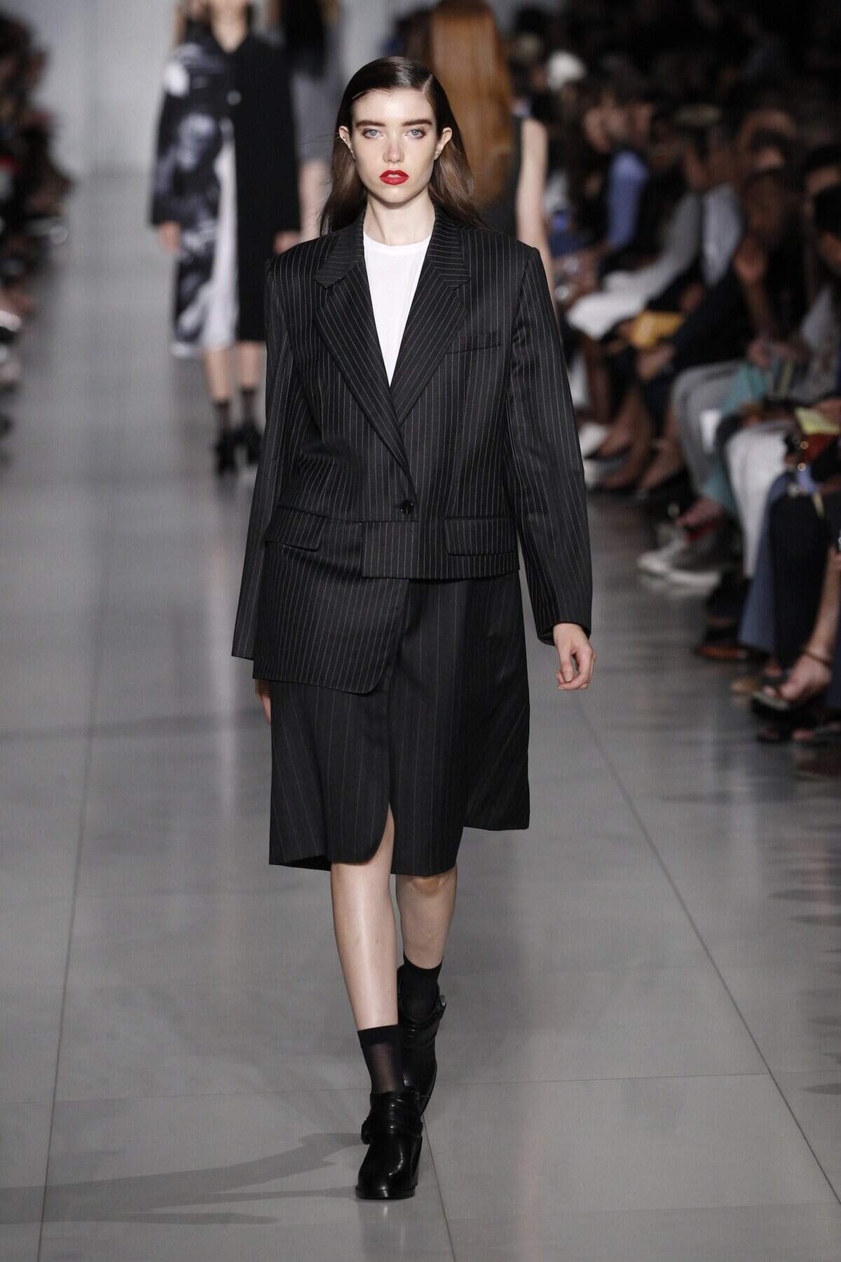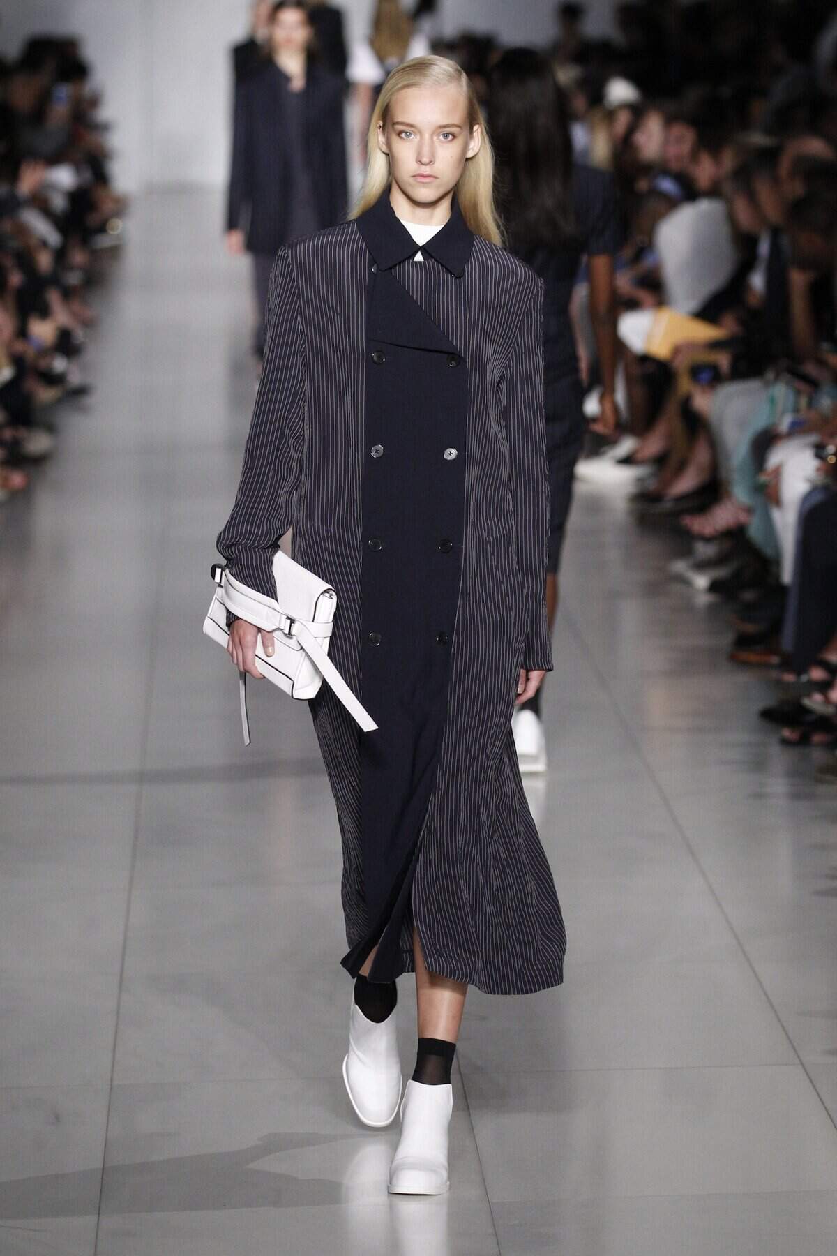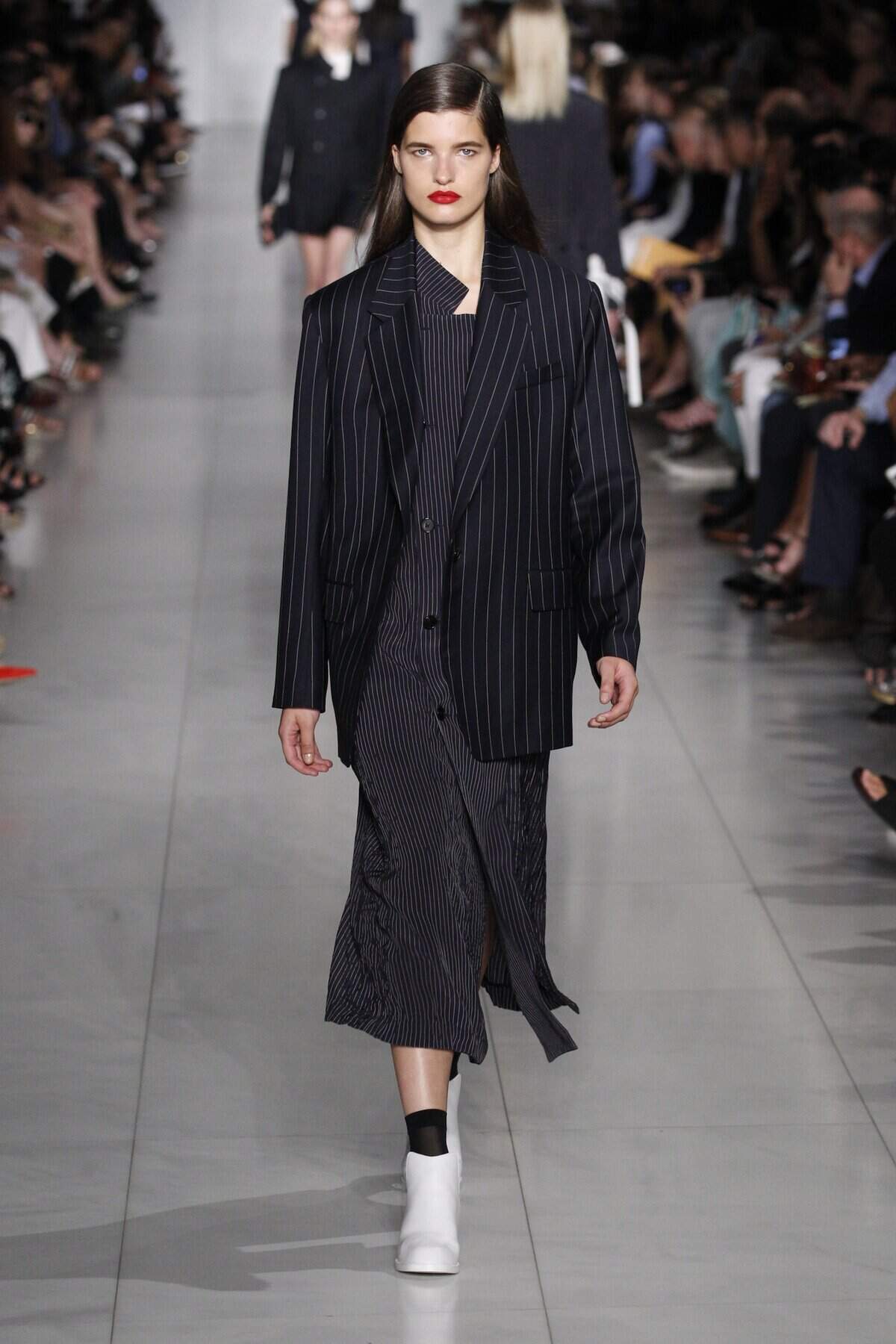 Founded in 1984 by Donna Karan, DKNY saw its first fashion week led by fashion directors other than Karan herself. Westfield World Trade Center West Gallery debuted DKNY’s Spring 2016 RTW collection under co-fashion directors and Public School co-founders Dao-Yi Chow and Maxwell Osborne. The beautifully tailored collection focused on a narrative on corporate America with pinstripes, blazers and a color palette more New York than having a fashion week presentation at a PATH station. Black, white, gray and navy blue were the colors on the runway with a mix of feminine and masculine silhouettes. Asymmetrical design, broad shoulders and large and fitted trench coats were also at play. The cityscape, architecture and essence of New York were heavily present in the collection which reflected the construction of the city.