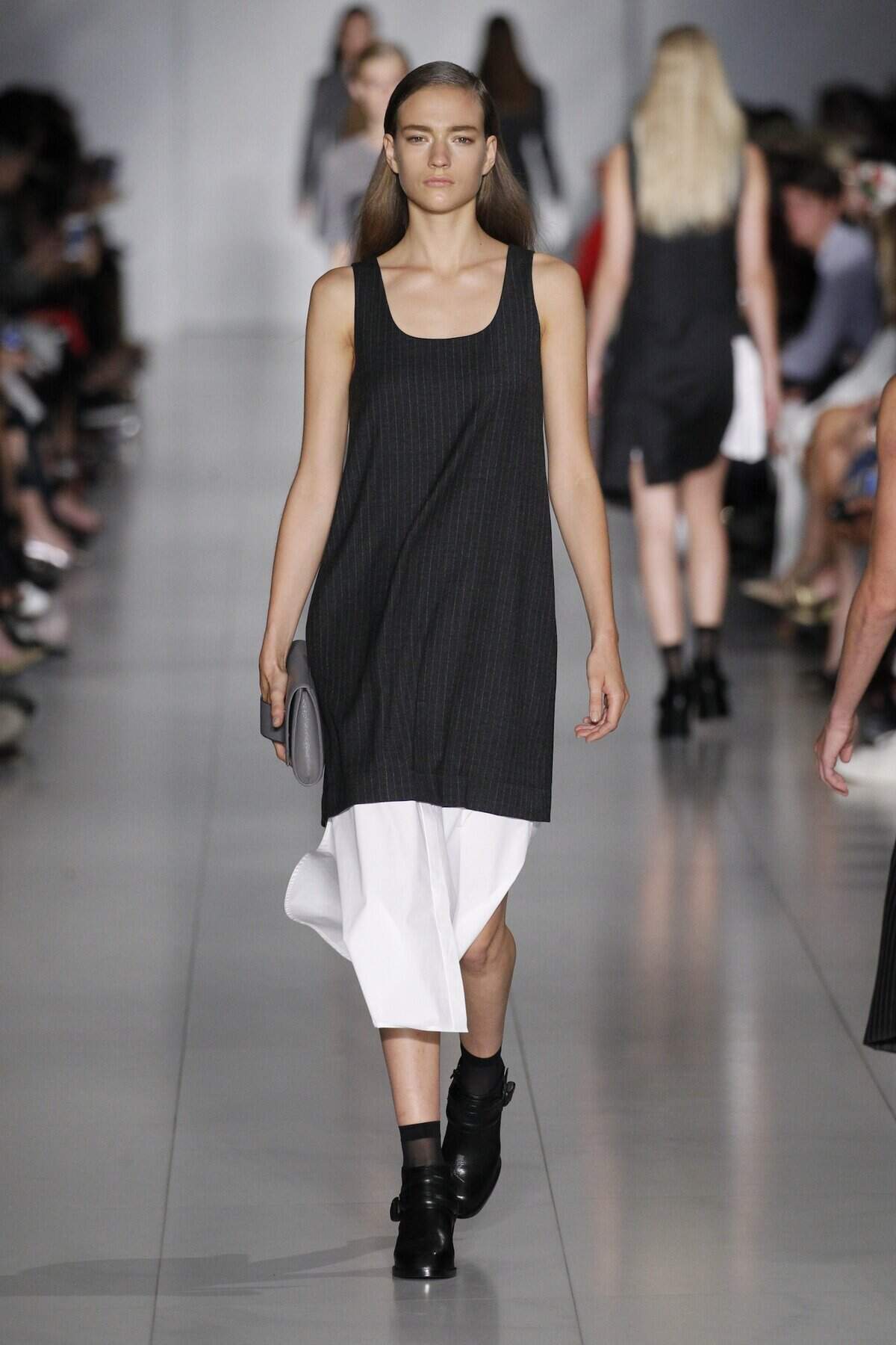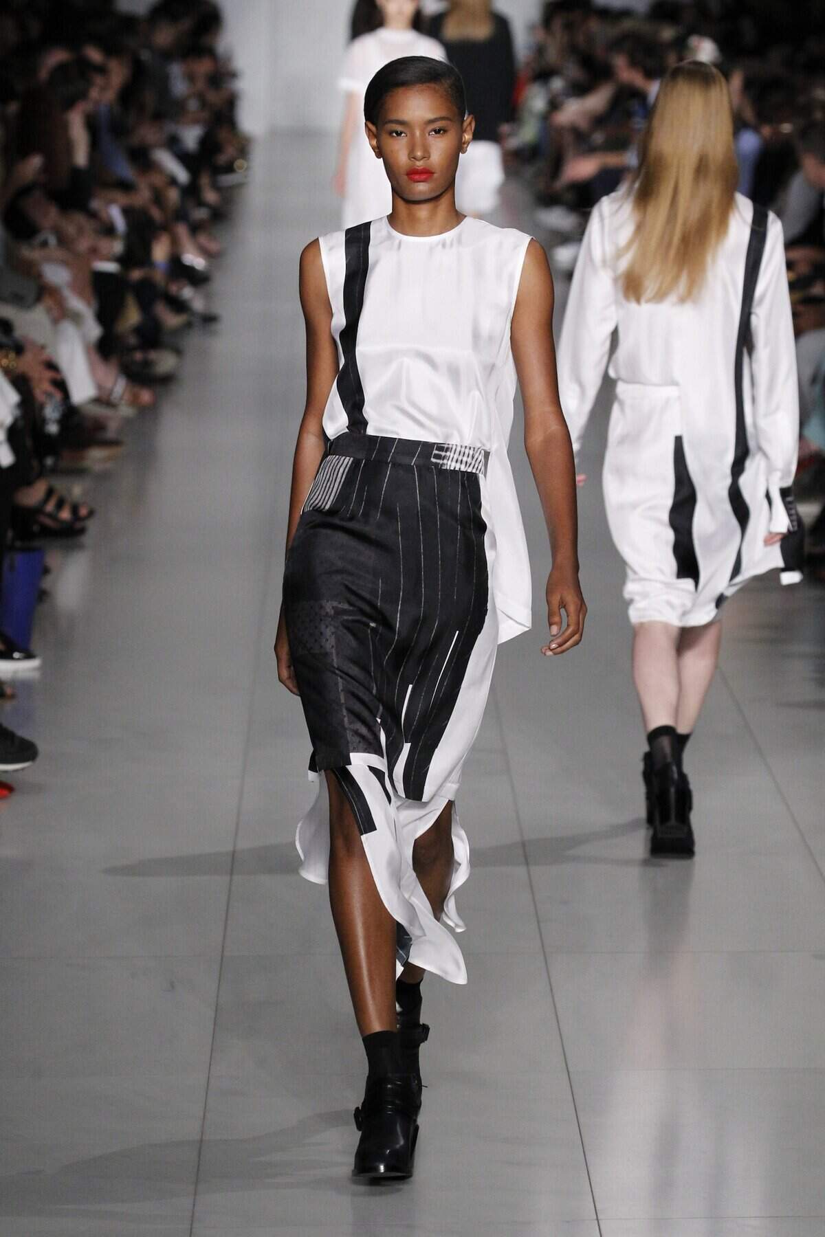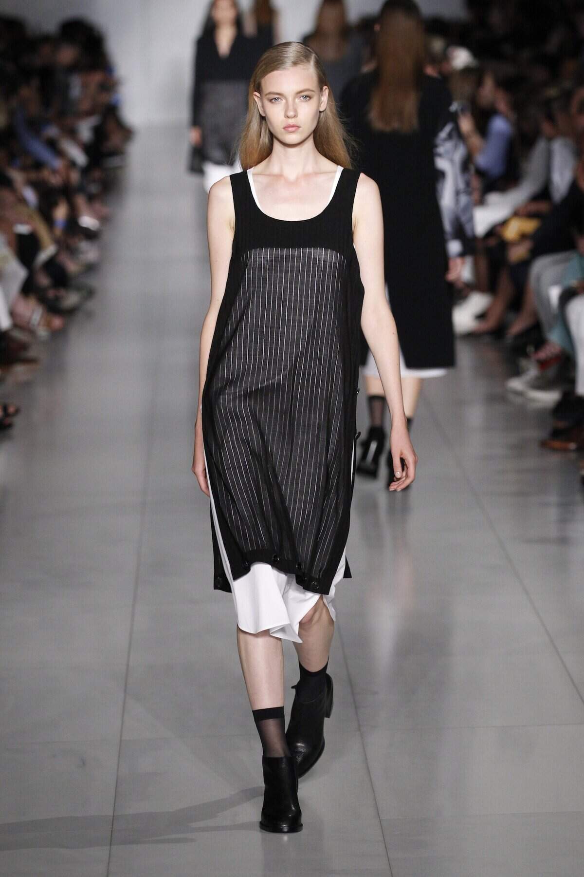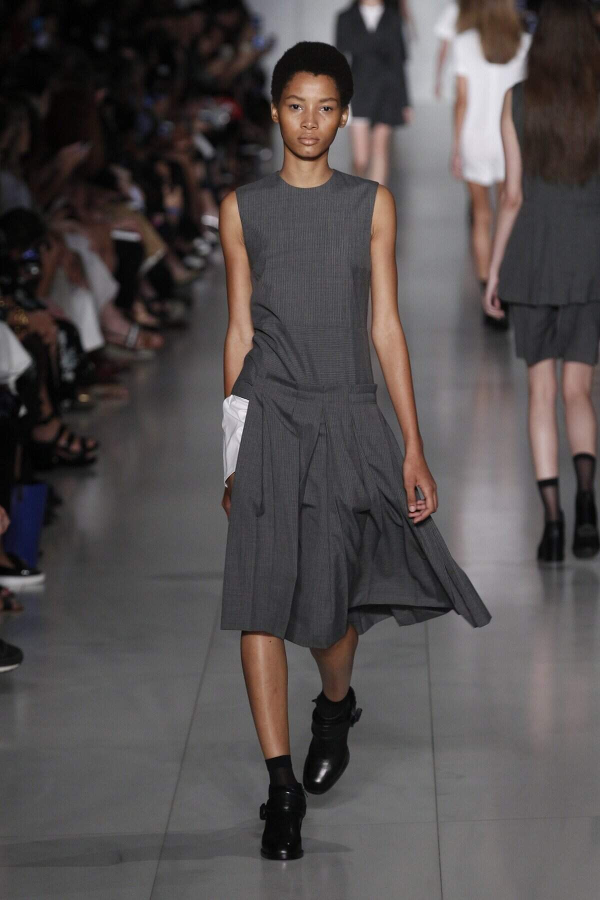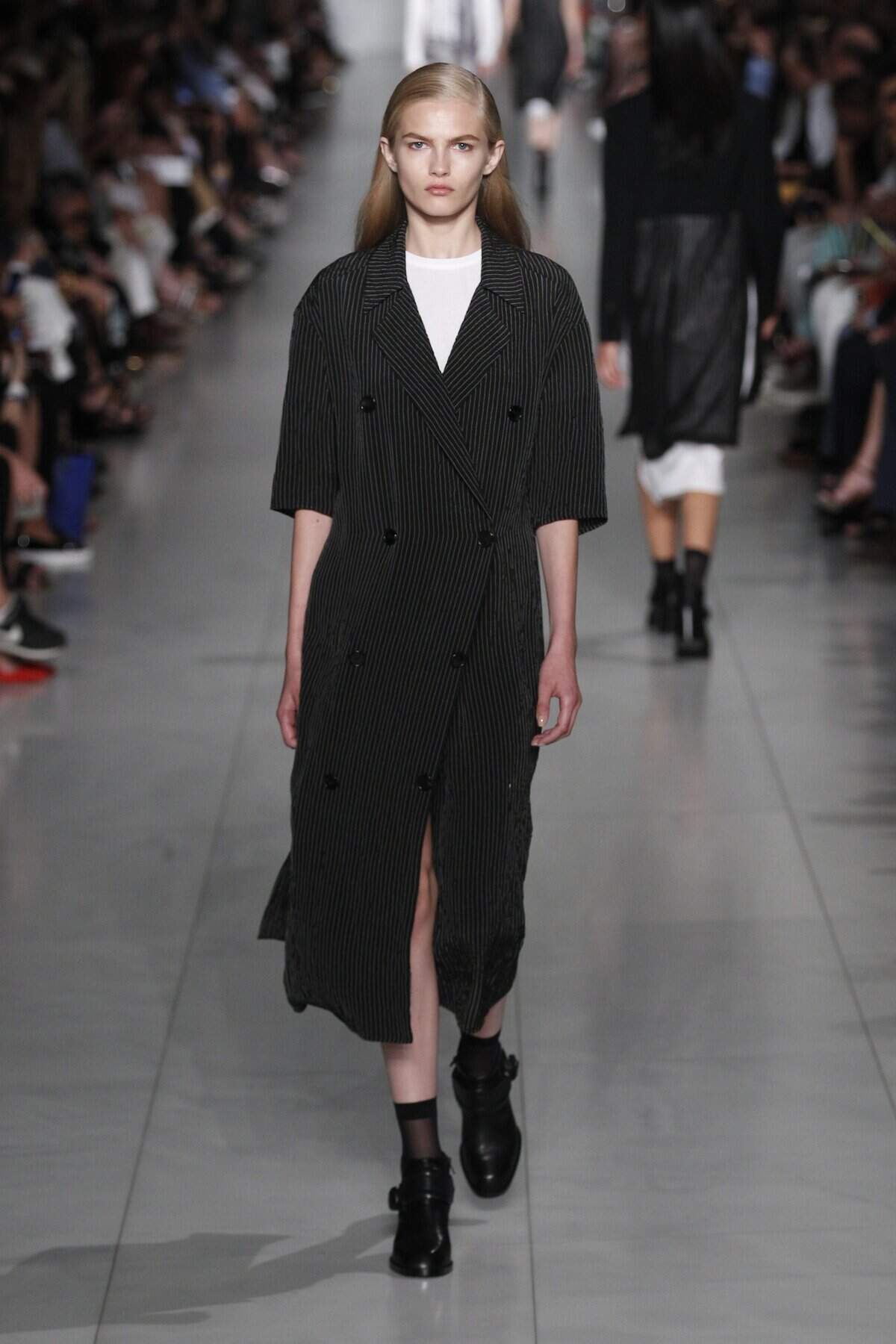 Founded in 1984 by Donna Karan, DKNY saw its first fashion week led by fashion directors other than Karan herself. Westfield World Trade Center West Gallery debuted DKNY’s Spring 2016 RTW collection under co-fashion directors and Public School co-founders Dao-Yi Chow and Maxwell Osborne. The beautifully tailored collection focused on a narrative on corporate America with pinstripes, blazers and a color palette more New York than having a fashion week presentation at a PATH station. Black, white, gray and navy blue were the colors on the runway with a mix of feminine and masculine silhouettes. Asymmetrical design, broad shoulders and large and fitted trench coats were also at play. The cityscape, architecture and essence of New York were heavily present in the collection which reflected the construction of the city.