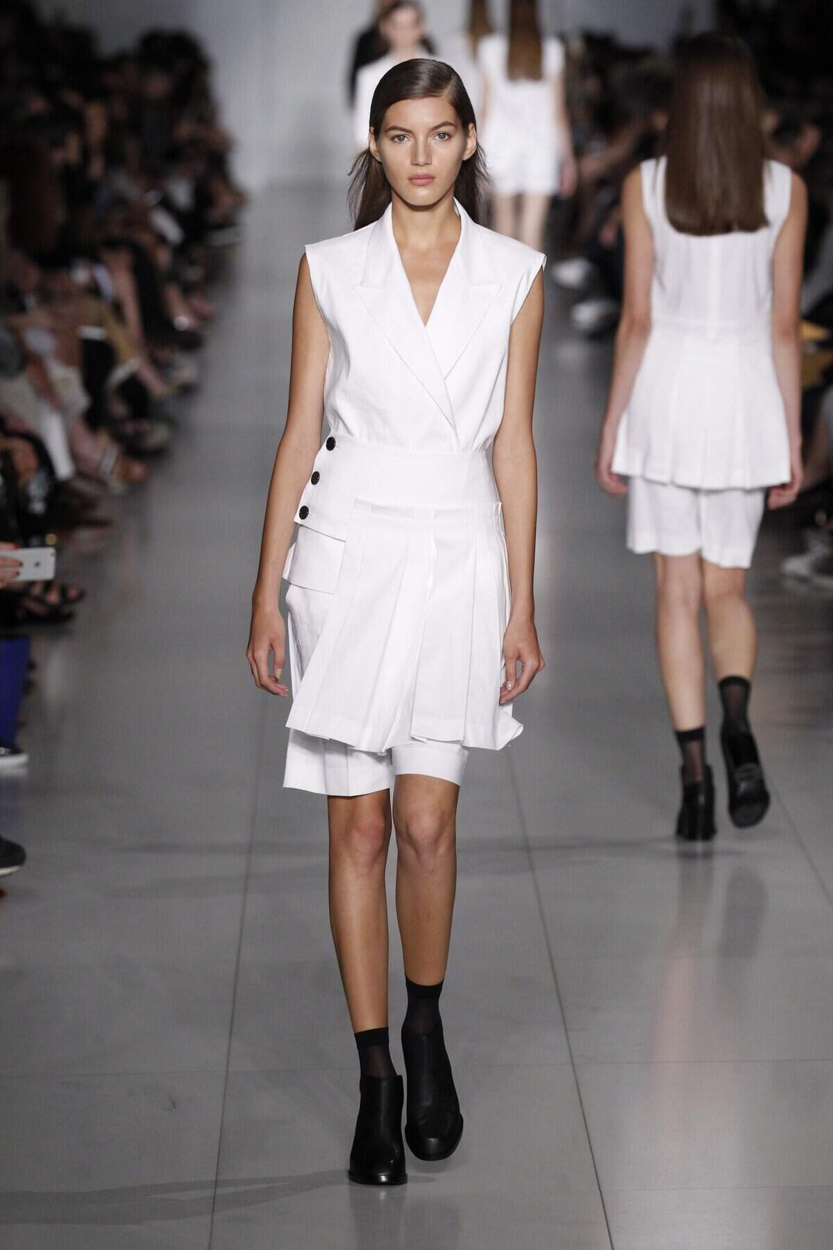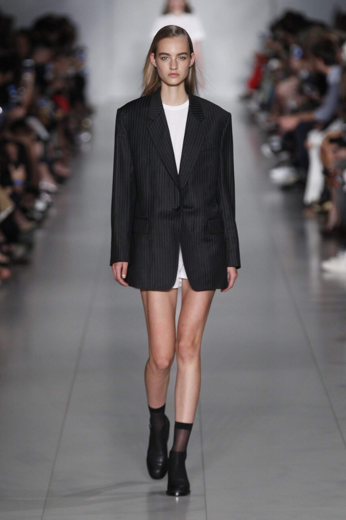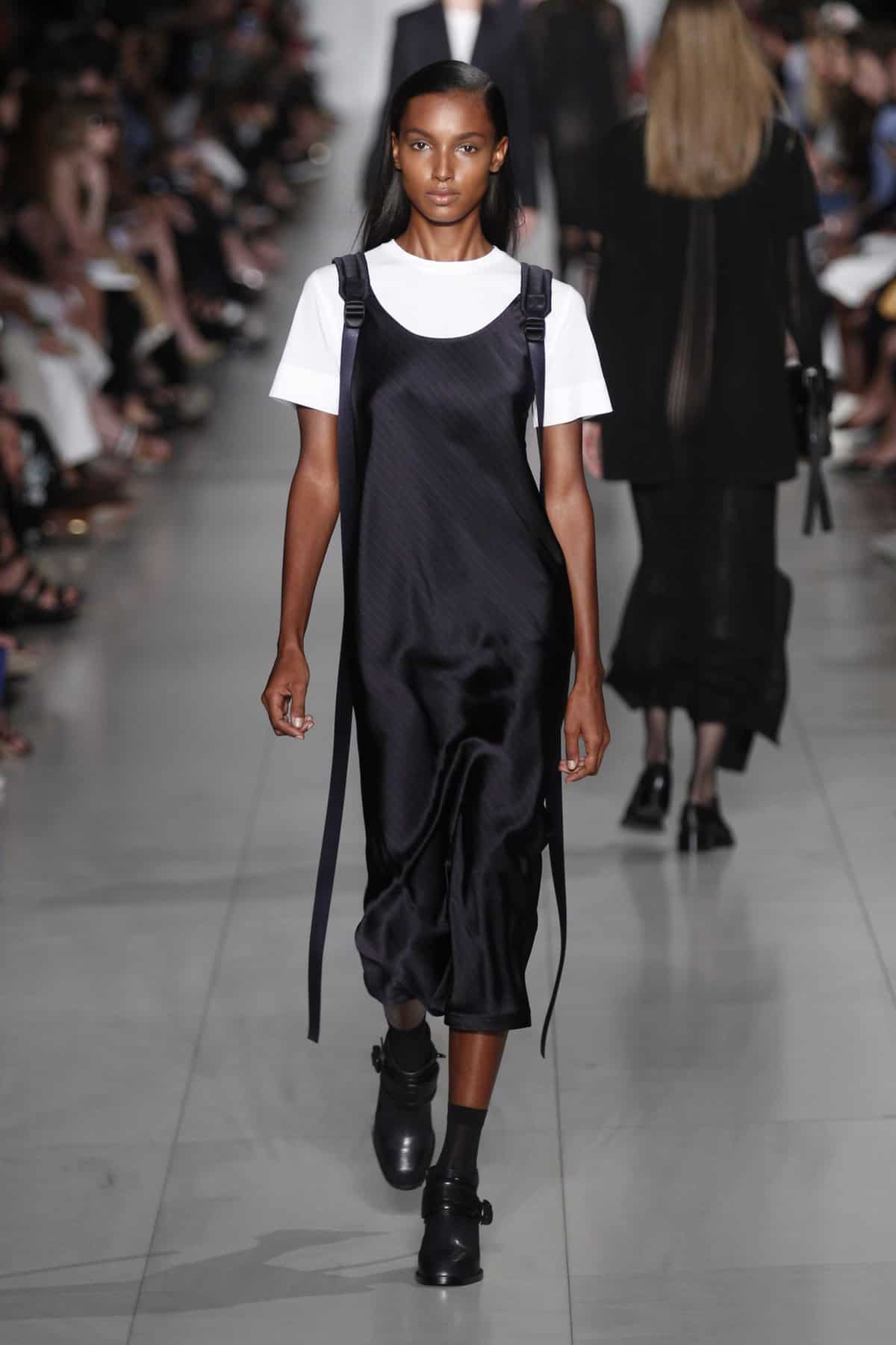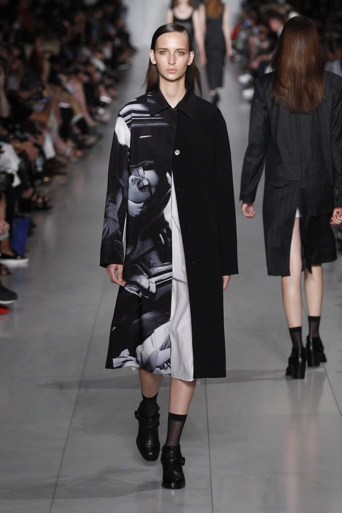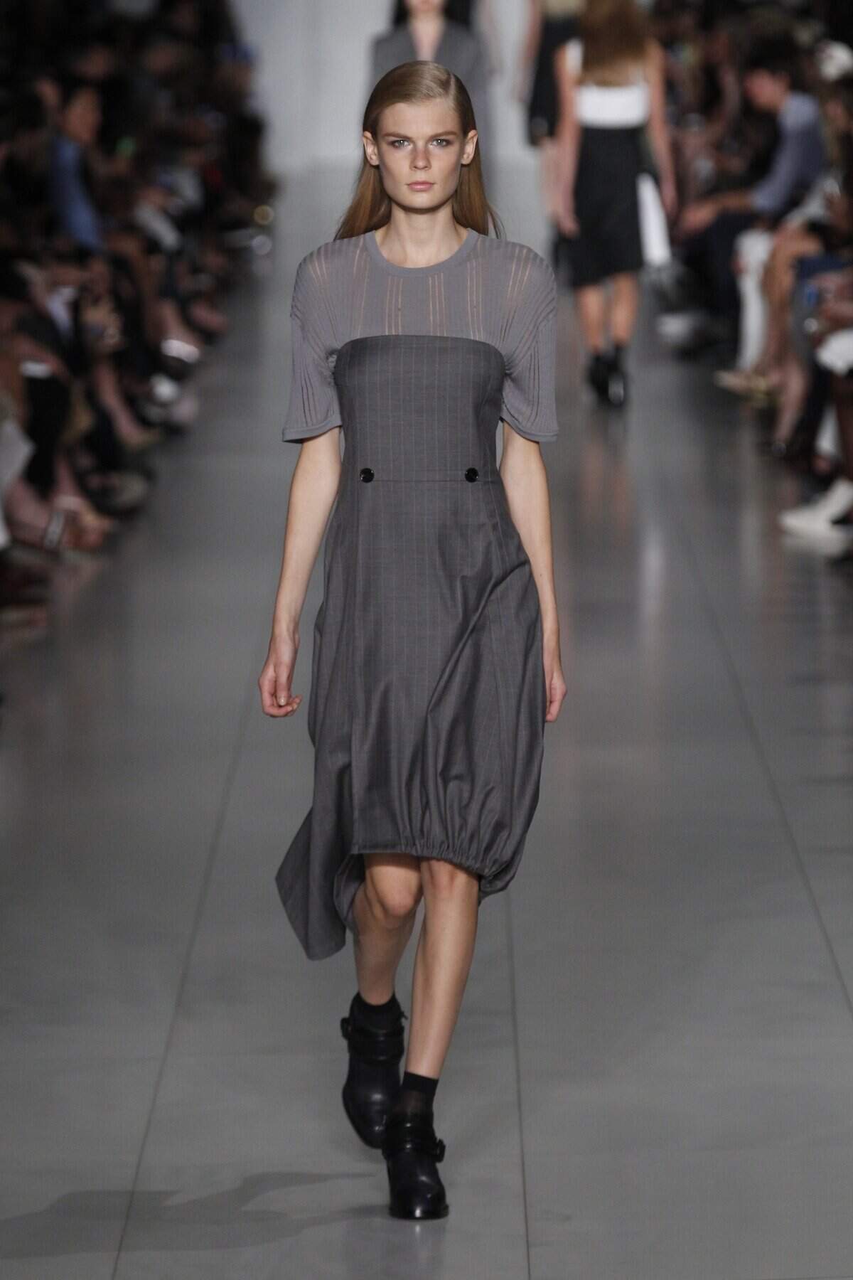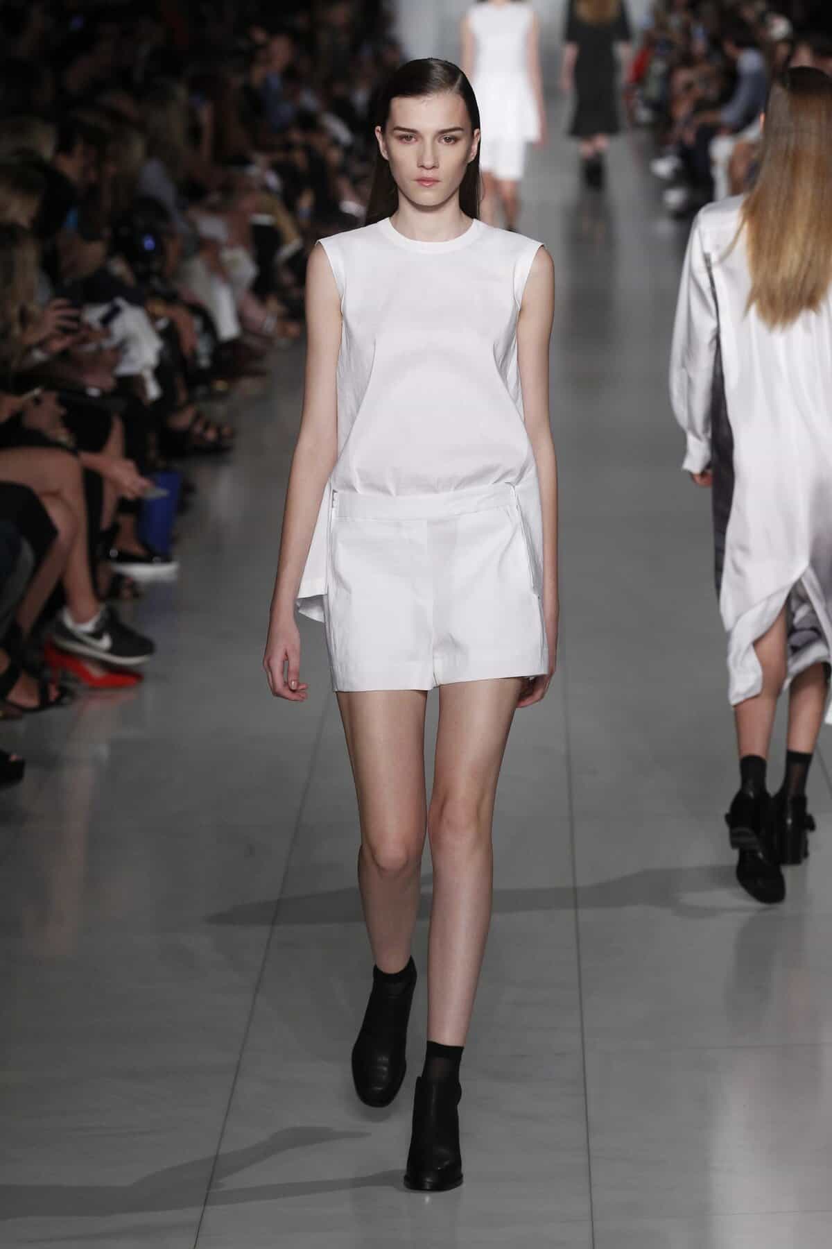Founded in 1984 by Donna Karan, DKNY saw its first fashion week led by fashion directors other than Karan herself. Westfield World Trade Center West Gallery debuted DKNY’s Spring 2016 RTW collection under co-fashion directors and Public School co-founders Dao-Yi Chow and Maxwell Osborne. The beautifully tailored collection focused on a narrative on corporate America with pinstripes, blazers and a color palette more New York than having a fashion week presentation at a PATH station. Black, white, gray and navy blue were the colors on the runway with a mix of feminine and masculine silhouettes. Asymmetrical design, broad shoulders and large and fitted trench coats were also at play. The cityscape, architecture and essence of New York were heavily present in the collection which reflected the construction of the city.