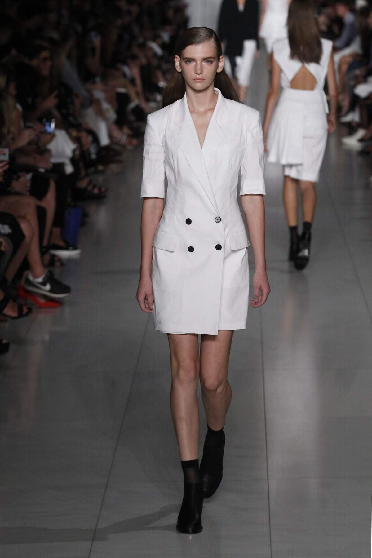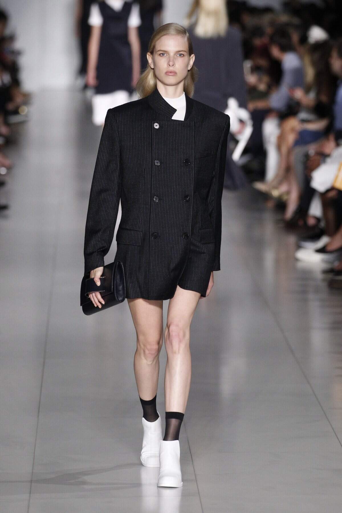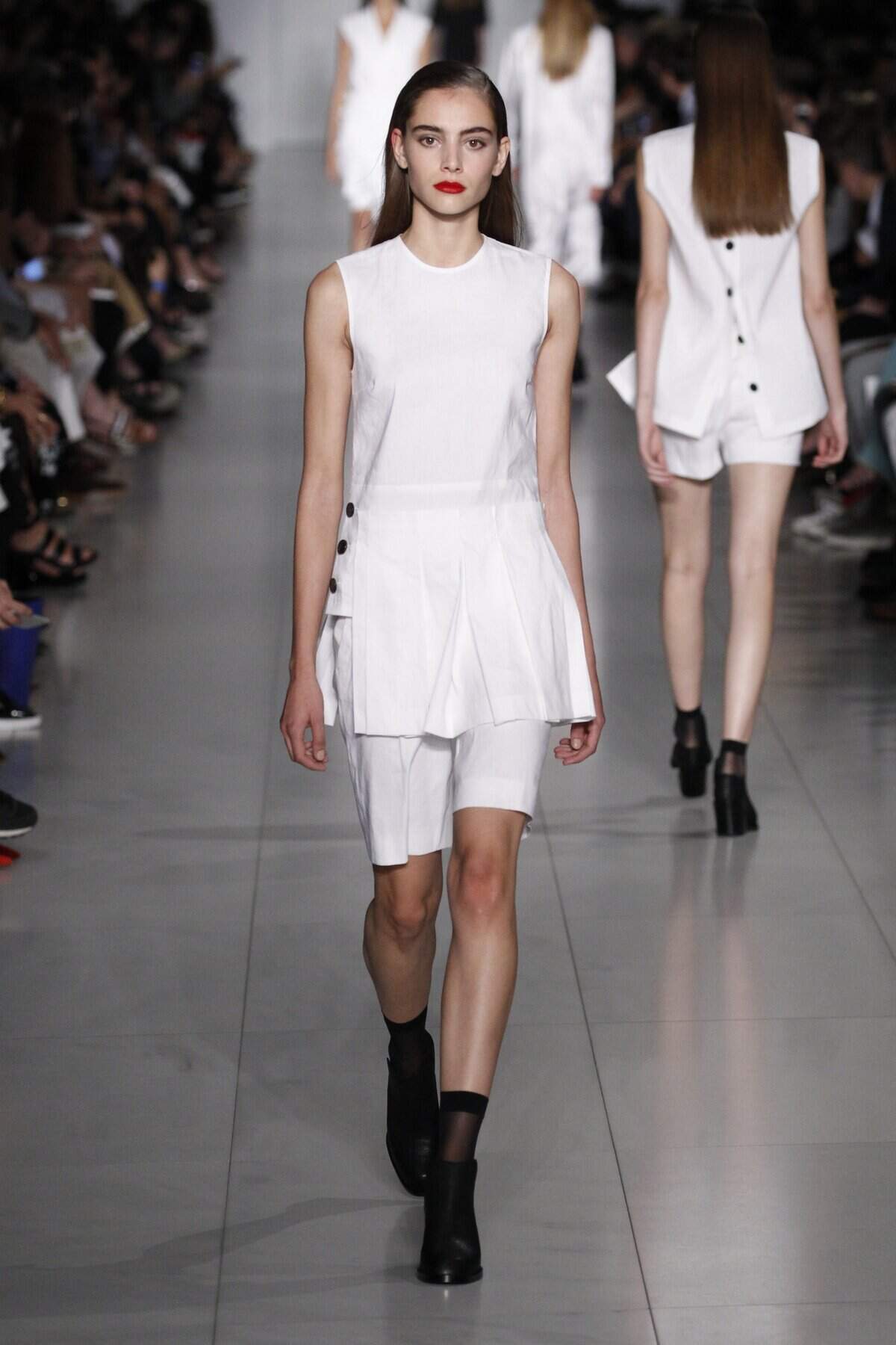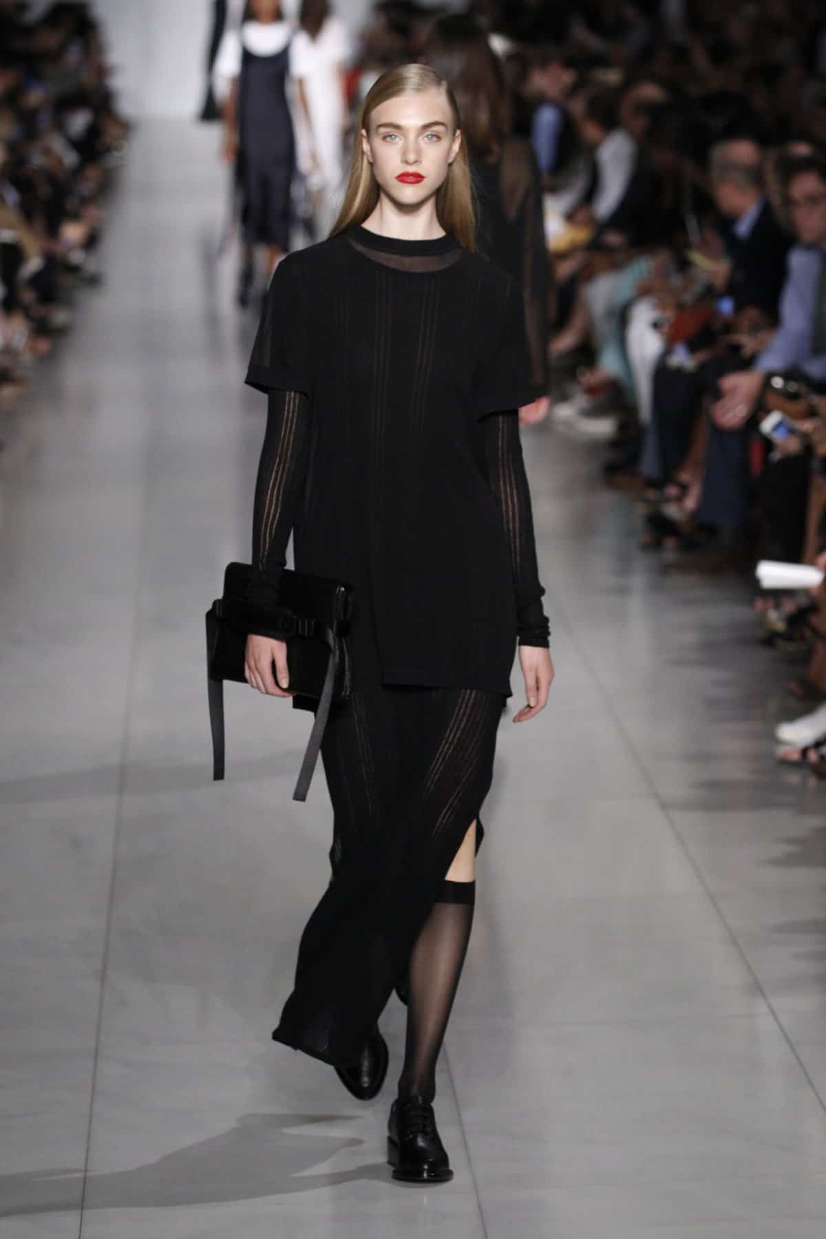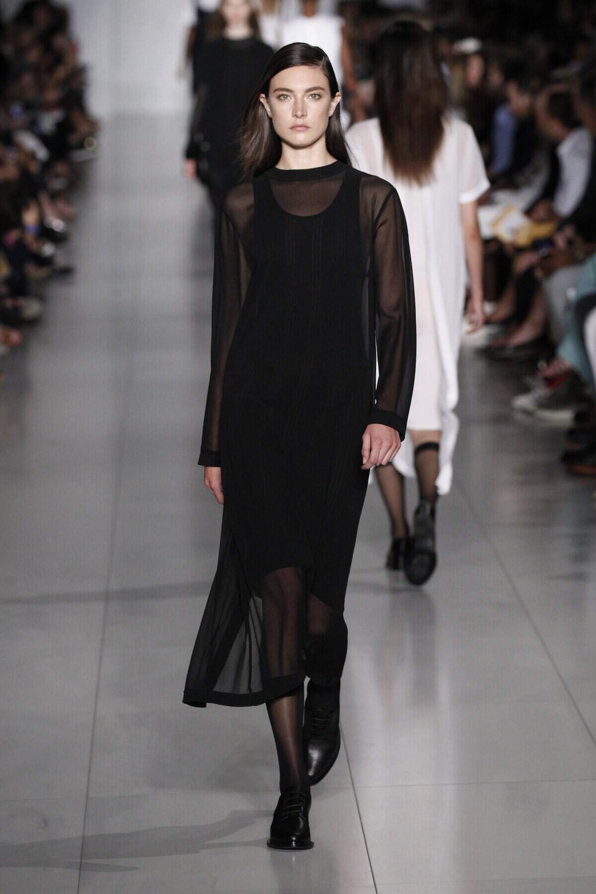 Founded in 1984 by Donna Karan, DKNY saw its first fashion week led by fashion directors other than Karan herself. Westfield World Trade Center West Gallery debuted DKNY’s Spring 2016 RTW collection under co-fashion directors and Public School co-founders Dao-Yi Chow and Maxwell Osborne. The beautifully tailored collection focused on a narrative on corporate America with pinstripes, blazers and a color palette more New York than having a fashion week presentation at a PATH station. Black, white, gray and navy blue were the colors on the runway with a mix of feminine and masculine silhouettes. Asymmetrical design, broad shoulders and large and fitted trench coats were also at play. The cityscape, architecture and essence of New York were heavily present in the collection which reflected the construction of the city.