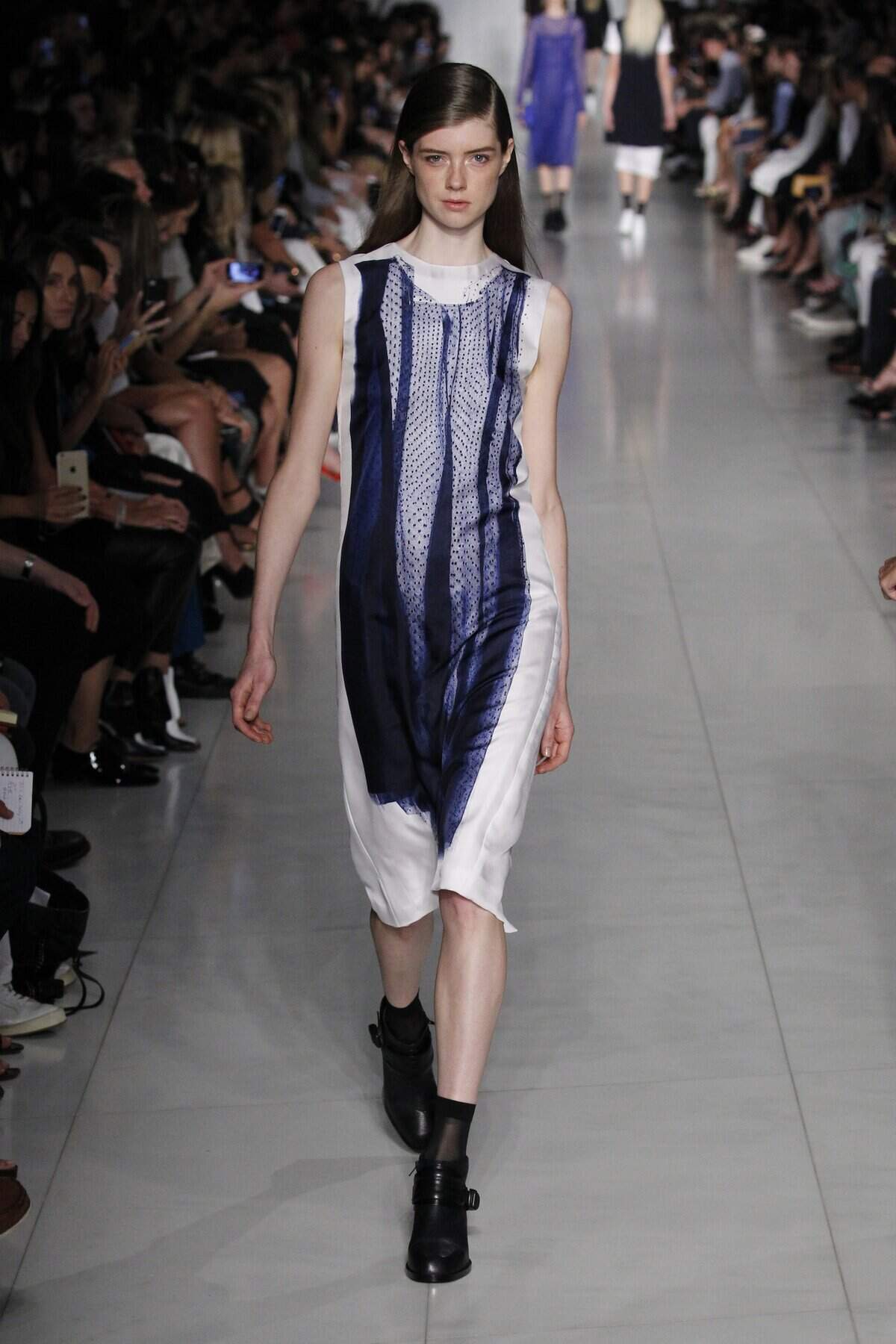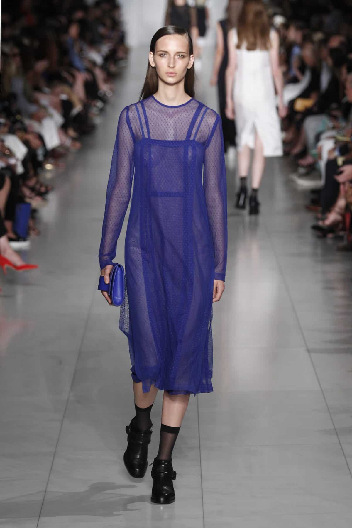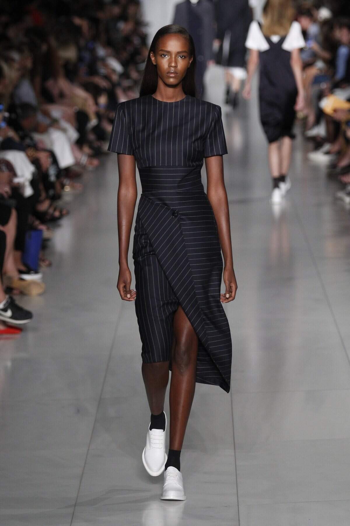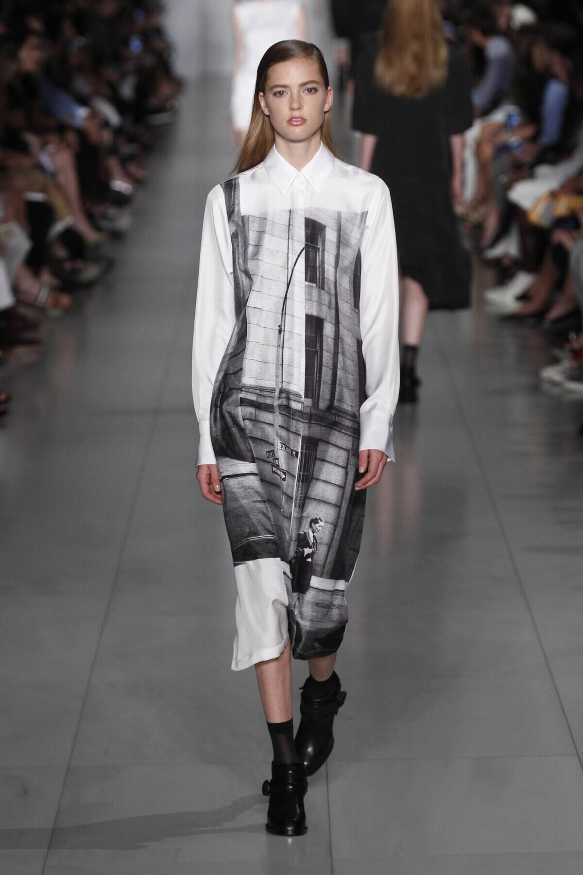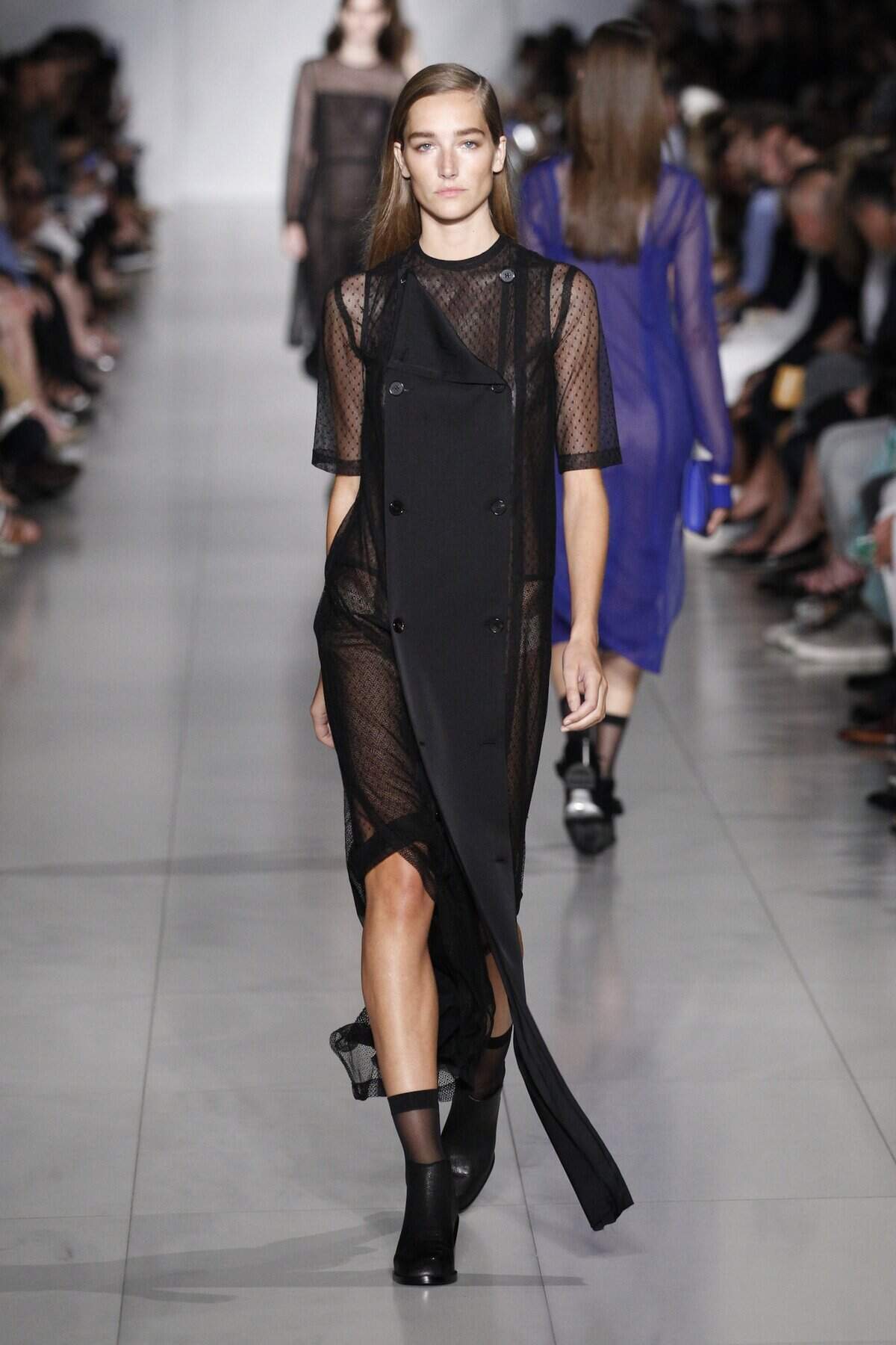 Founded in 1984 by Donna Karan, DKNY saw its first fashion week led by fashion directors other than Karan herself. Westfield World Trade Center West Gallery debuted DKNY’s Spring 2016 RTW collection under co-fashion directors and Public School co-founders Dao-Yi Chow and Maxwell Osborne. The beautifully tailored collection focused on a narrative on corporate America with pinstripes, blazers and a color palette more New York than having a fashion week presentation at a PATH station. Black, white, gray and navy blue were the colors on the runway with a mix of feminine and masculine silhouettes. Asymmetrical design, broad shoulders and large and fitted trench coats were also at play. The cityscape, architecture and essence of New York were heavily present in the collection which reflected the construction of the city.