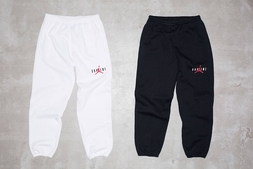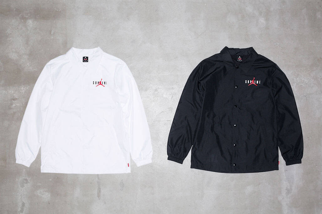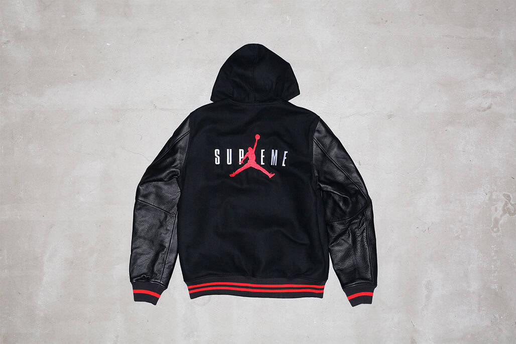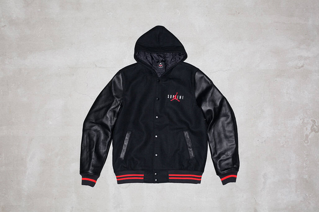 The iconic Jumpman is seen juxtaposed against bold Supreme branding on multiple pieces that are set to coincide with the recent release of the Supreme x Air Jordan 5 sneaker. Supreme has linked with Jordan Brand and the meeting of worlds left the Internet feeling empty and destroyed when the kicks sold out within mere minutes of appearance last week, so prepare for these items to be far from easy to obtain. Utilizing the classic Chicago Bulls black/red and white/red, the hues found on timeless Jordan footwear pieces are utilized on street ready urban wear gear. A leather sleeved and hooded varsity jacket, coaches jackets, sweatpants, hoodies, t-shirts and hats are all included in the collection and all stylishly incorporate the storied Jumpman graphic. If your intrigued by any of the soon to drop clothing pieces, hit up the online retail launch of the collection or venture to the New York, Los Angeles or London Supreme locations on October 22.