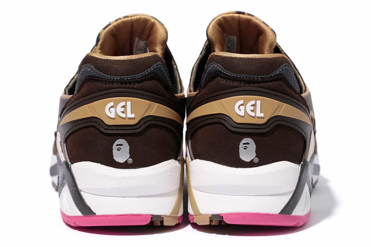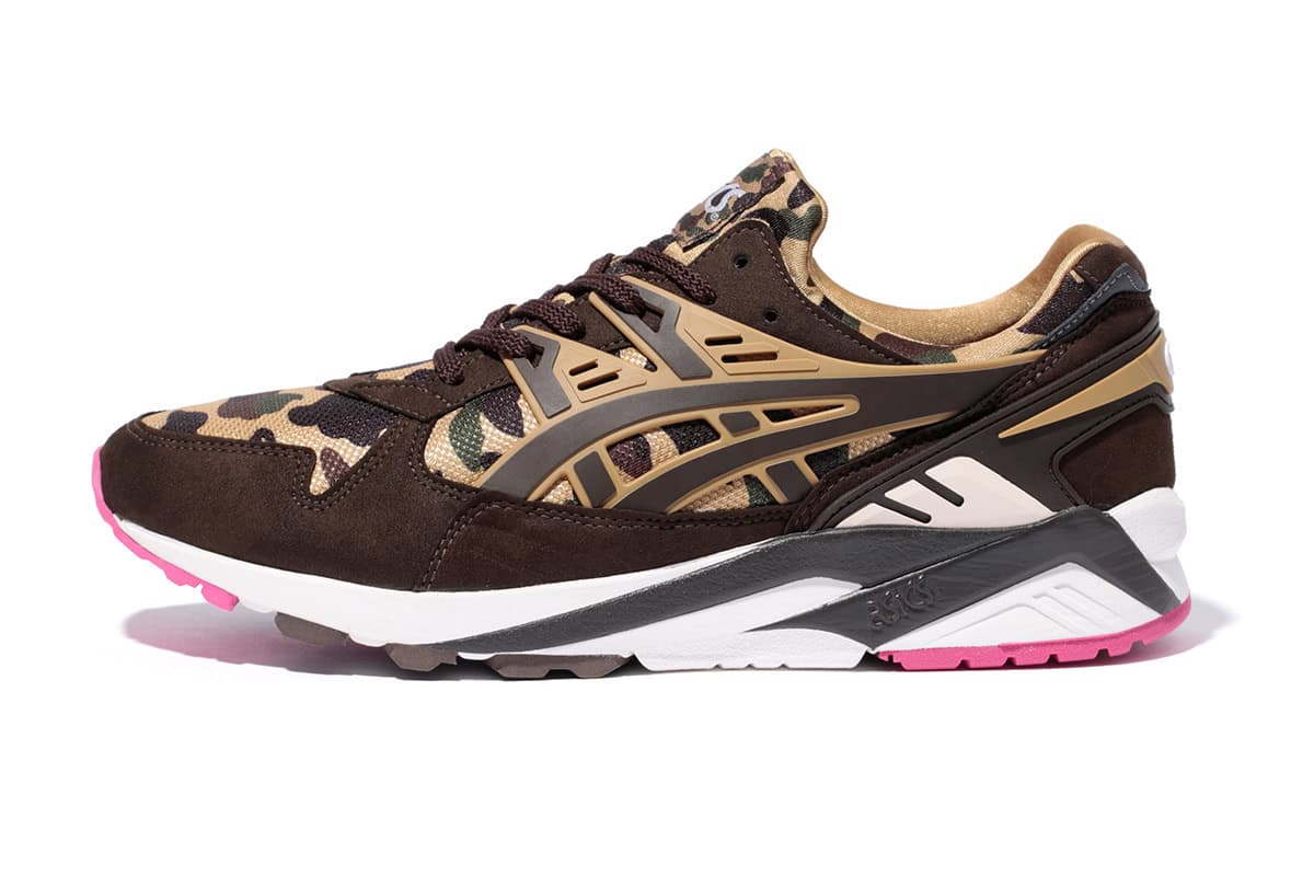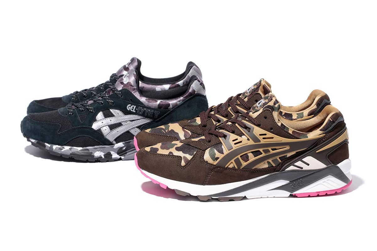 Storied Japenese clothing outfitters a Bathing Ape and ASICS Tiger have joined minds and are soon providing their collective fanbases with two new footwear iterations. Utilizing the Gel-Kayano Trainer and retro Gel-Lyte V as canvases, Bape has once again decorated a selection of running sneakers in the classic and undeniable 1st camouflage print it is revered for. Adorned in a desert camo pattern with brown suede paneling and pink outsole hits, the Kayano sneakers provide color with an all black and white camouflage, 3m infused pair of Gel Lytes offering up a shadowy contrast within the forthcoming sneaker set. The iconic a Bathing Ape head logo is boldly setup and featured on the heel of both running sneakers along with stylized GEL wording on the desert camo option.