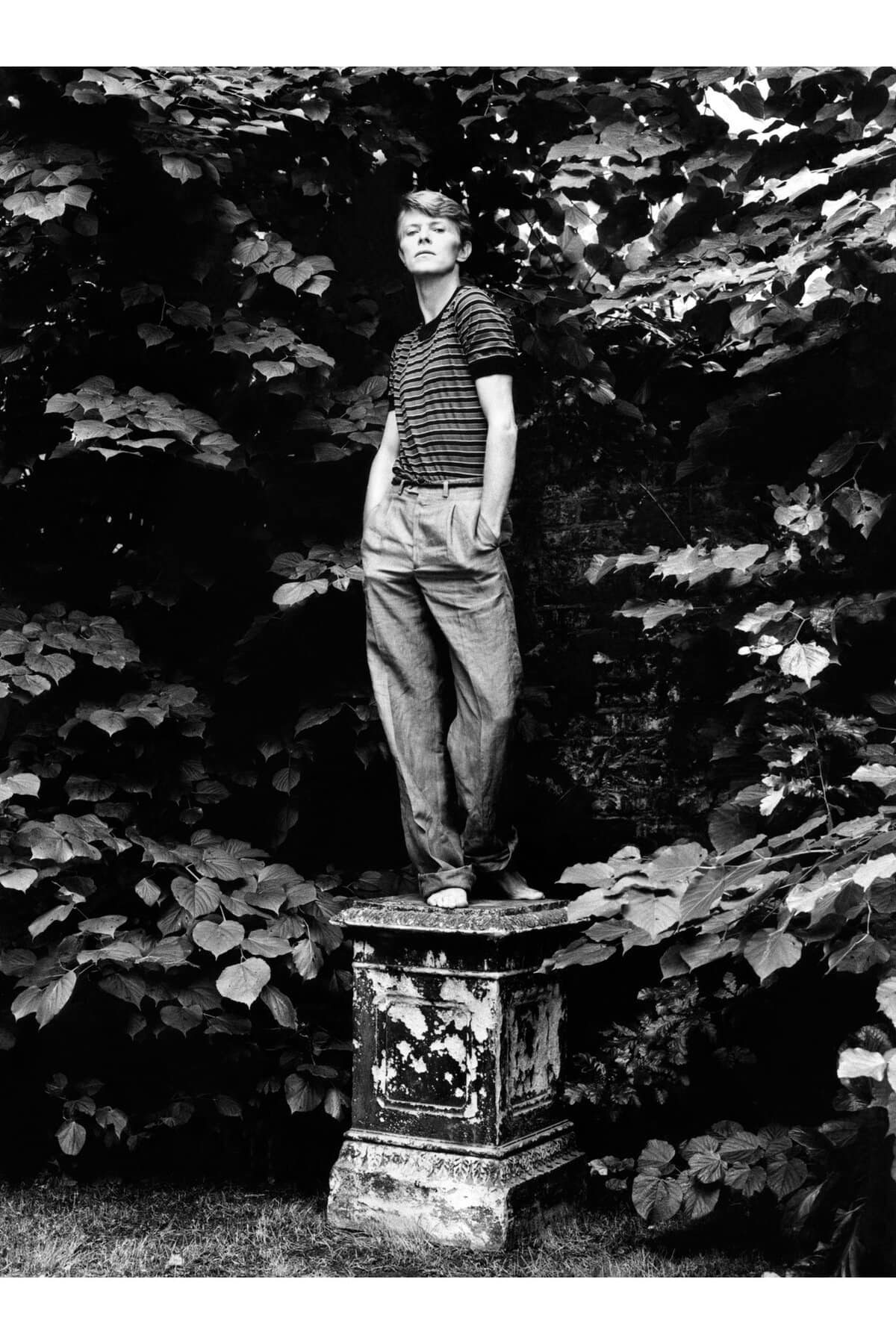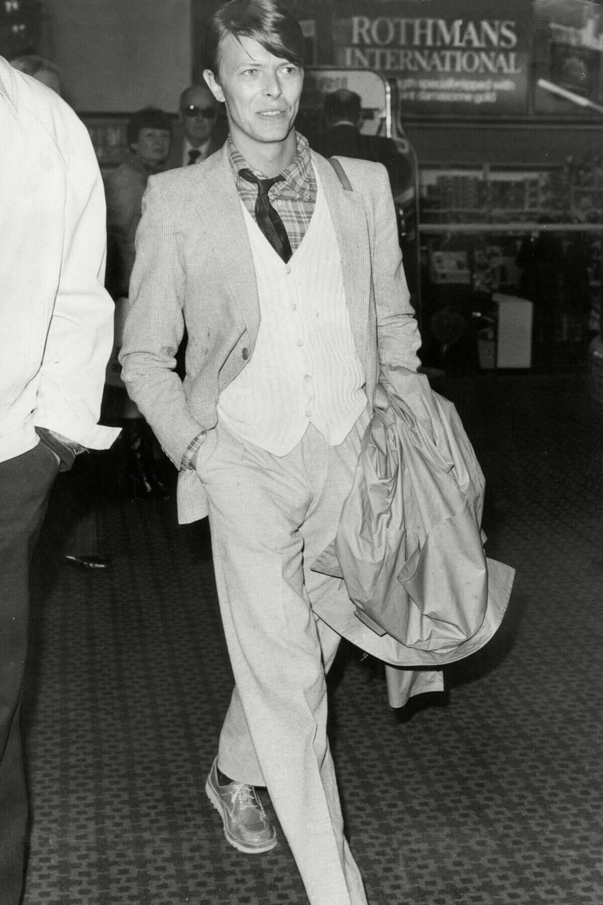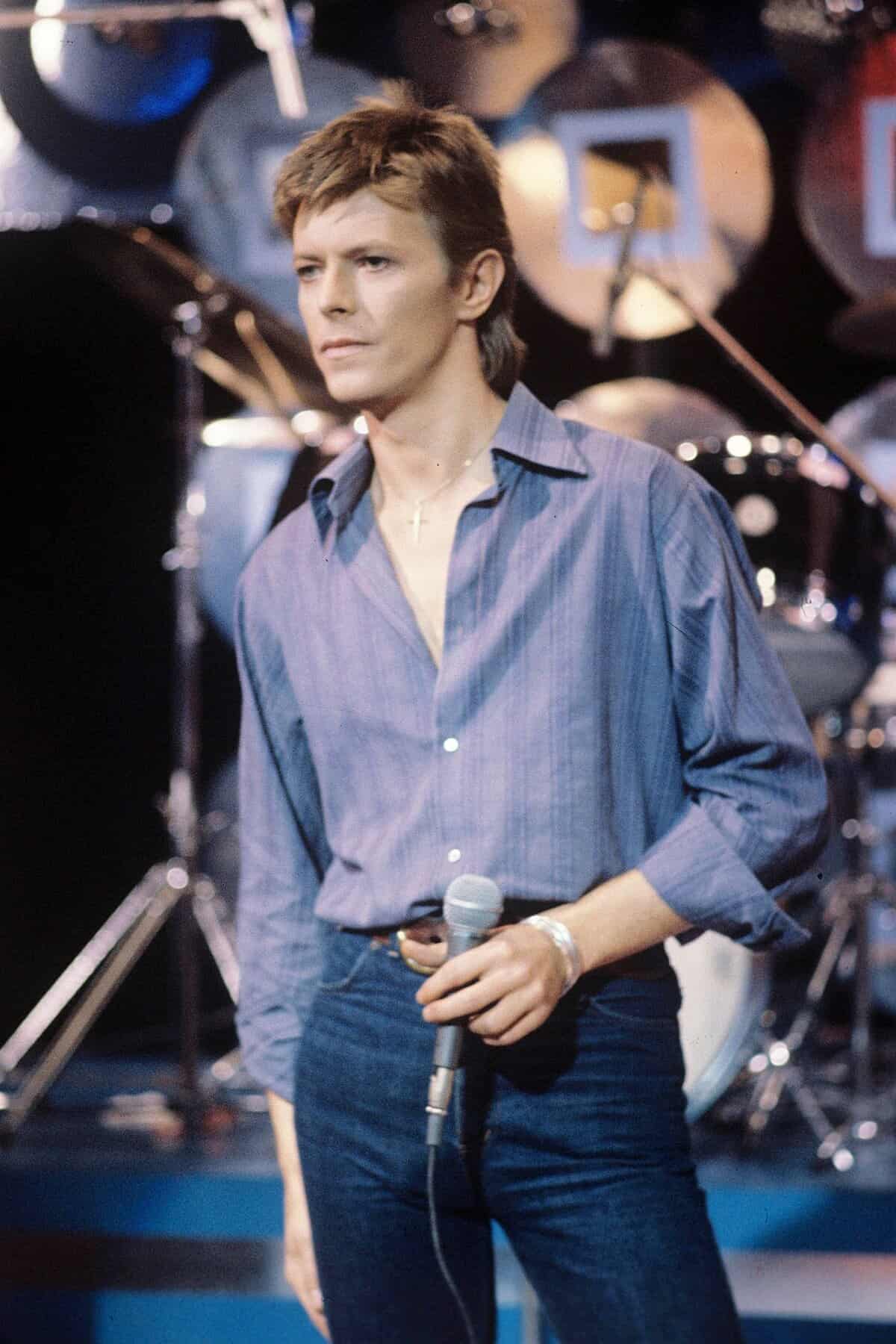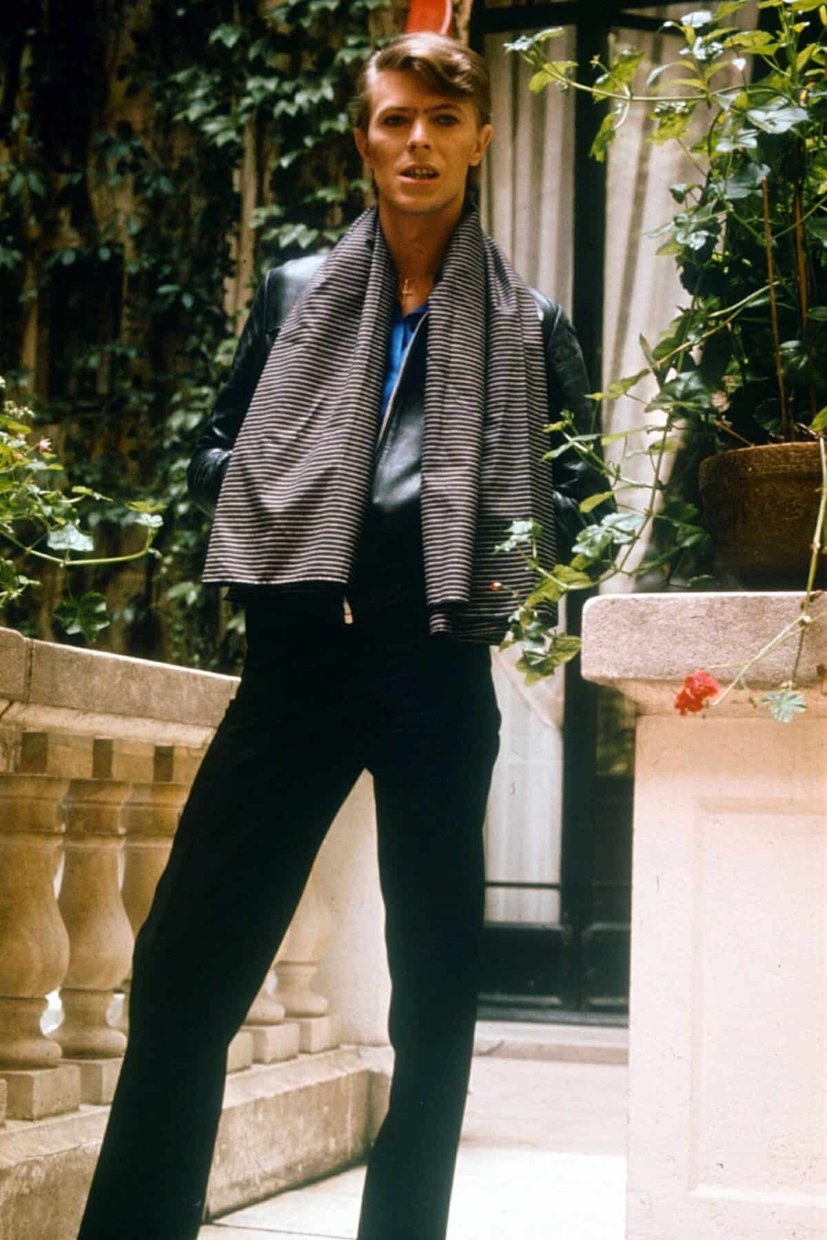 1977 saw Bowie move to Berlin to escape his dangerous drug problem. The artist left the glam behind and formed a laid back but overtly stylish look. Adopting the wear of the times and trends of the 70s, he is depicted wearing flared high-waisted trousers, a striped scarf and leather coat. Still completely thin, his waist was said to be a small 26 inches. From 1977 to the time of his passing, David Bowie adopted the persona of David Bowie. The man behind the lights and cameras, who had gone under the guise of a mod teenager, Ziggy Stardust, Aladdin Sane and Thin White Duke would focus on consistently putting together strikingly fashionable and trend influenced looks for himself.