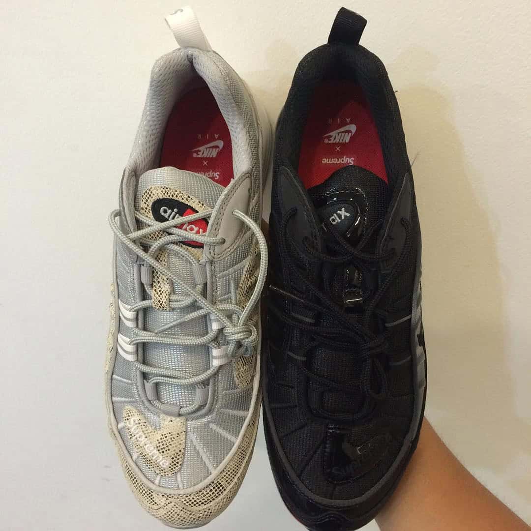 Images have leaked of a the next supposed Supreme x Nike collaborative release. Utilizing the Air Max 98 silhouette, it seems as though Supreme will outfit the retro runner with a pearlized snakeskin on one pair and a completely solid black color way on another. While photos of only two color ways have surfaced online, it’s rumored that there are two more pairs apart of the collection that remain to be seen.