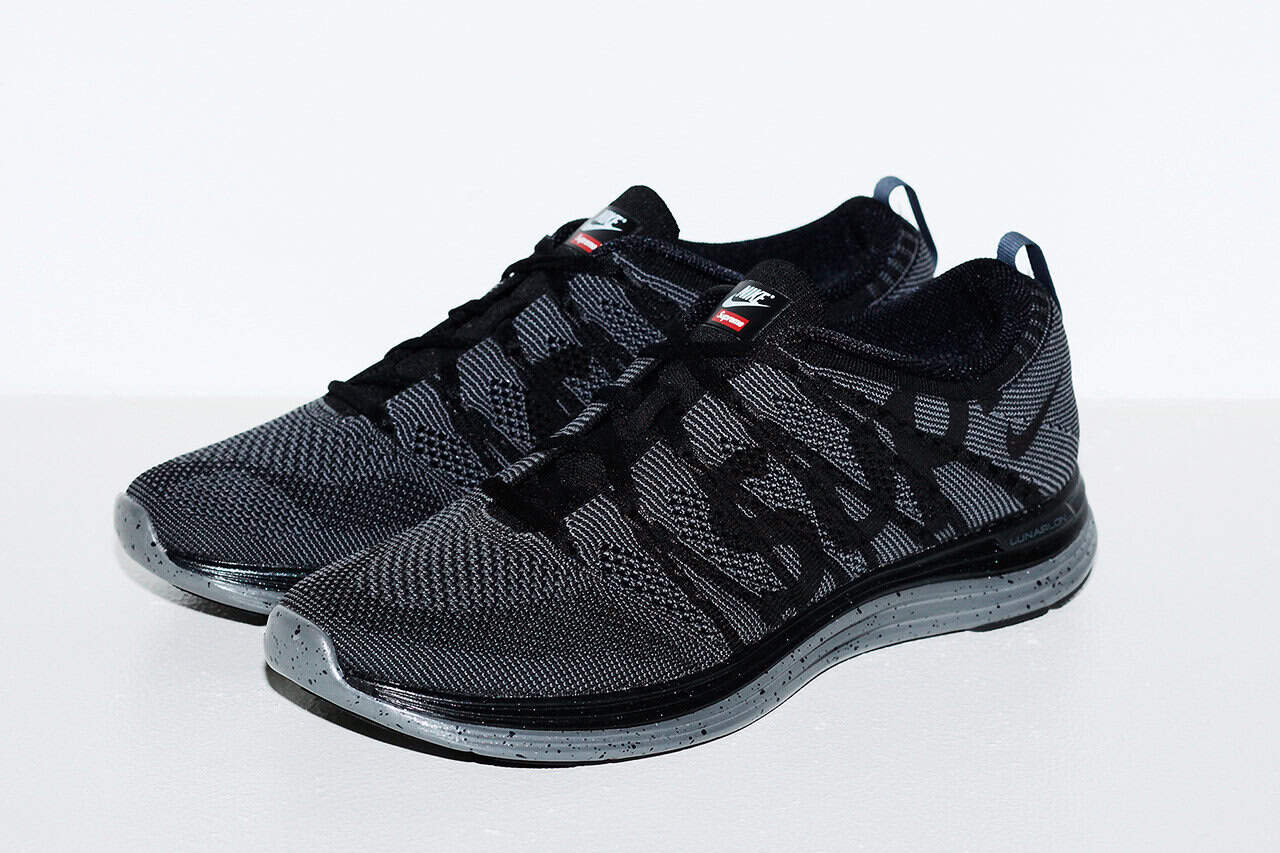 Taking the white hot in popularity silhouette of the Nike Flyknit Lunar 1 running sneaker, Supreme challenged themselves once again to step outside their deemed “comfort zone” and take a stab at an overtly performance based product. Running sneakers by 2013 are worn with all forms of apparel flashy and elegant and Supreme gave the wide community of comfort obsessed style conscious buyers a cosigned version of the footwear form.