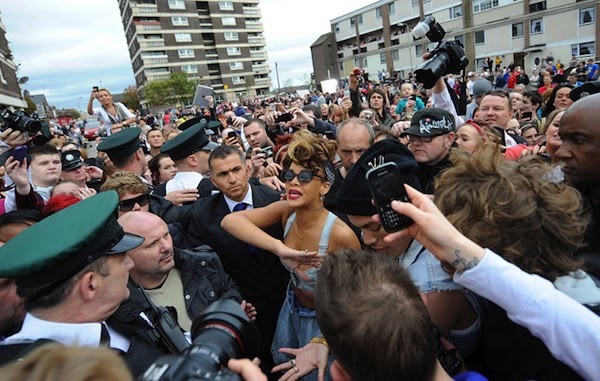 Out in Northern Ireland, Rihanna rocked a denim bralette and skirt from the Jeremey Scott Spring/Summer 2012 collection. Filming on location the “We Found Love” video, Ri paired the ostentatious designer’s garment with a bandana wrapped like Tupac, rebellious with her middle finger up.
