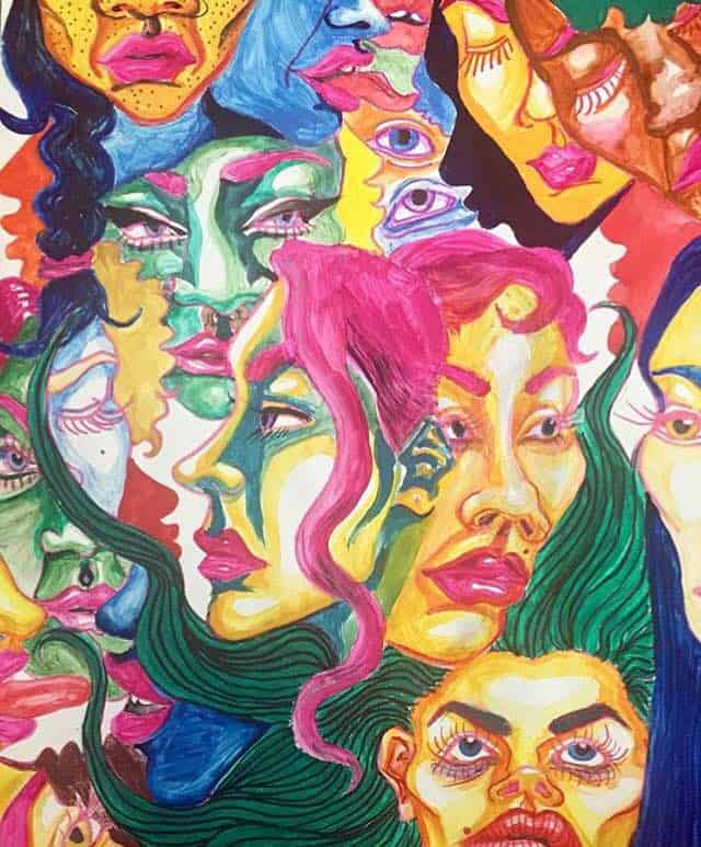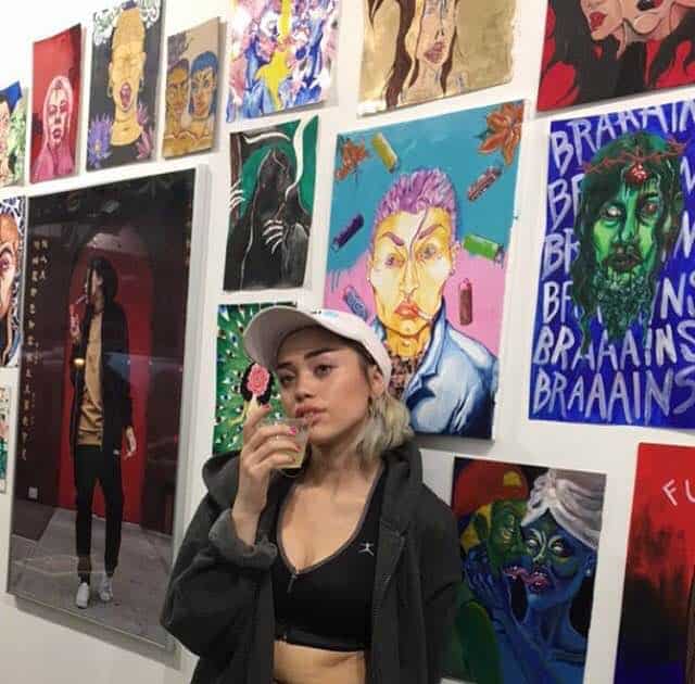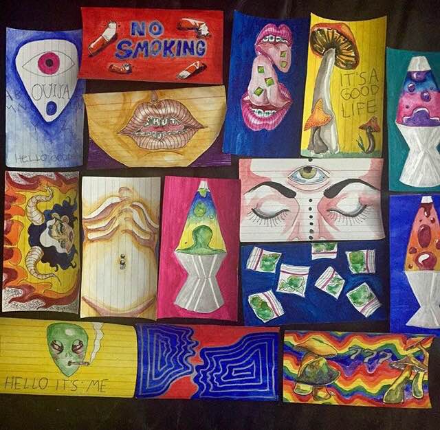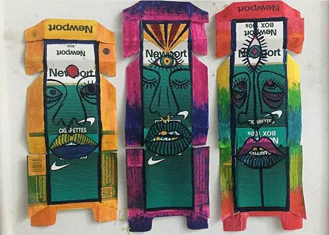 Lately, she’s been displaying psychedelic images of substances and figures, along with conscious messages, and a series of dark grungy monstrous and erotic beings. She’s also been using Newport cigarette boxes as her canvas for her colorful sketches.