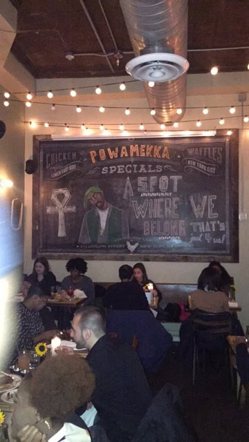 Since the Sweet Chick to Powamekka transformation had a limited time availability, fans came out in droves to capture the materialized brainchild of Tupac as well as enjoy some delicious, southern-style food. With very little preparation, the Sweet Chick LES manager Andrew Dougherty and his waitstaff did a superb job of handling the high demand of customers as well as distinguished guests of the spot such as basketball legend Isaiah Thomas, the Celtics’ Rajon Rondo and even Nas himself. With menu options such as mac and cheese, Pac Wings, and Tupac’s self created “Thug Passion” alcoholic drink, it’s safe to say that Powamekka was a great spot for any Hip Hop fan to experience a once in a lifetime moment dedicated to Tupac as well as some great food to eat.