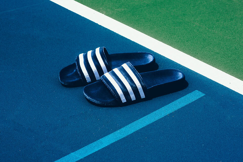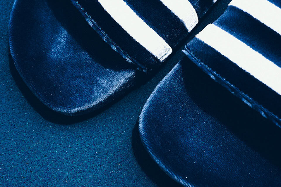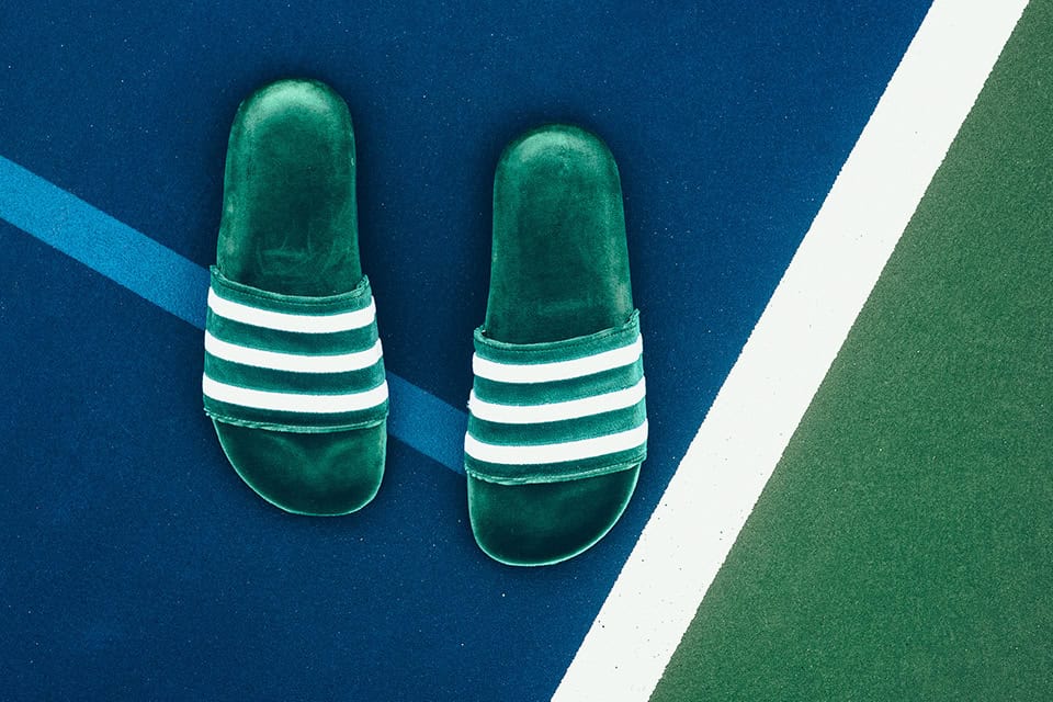 Adidas‘s drops a cozy release with their new velvet edition. The color way features “Collegiate Green”and “Mystery Blue” with the original three stripes all in velvet. These slides are available now at Sneaker Politics for $45.
