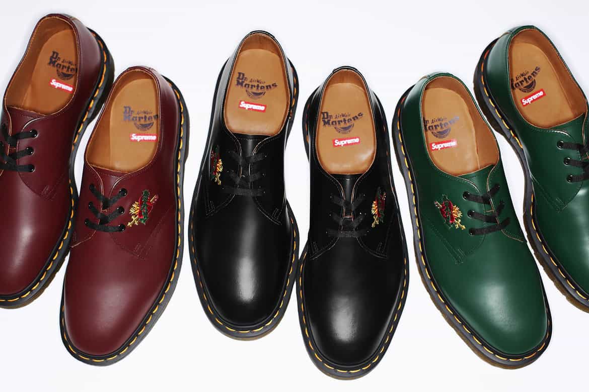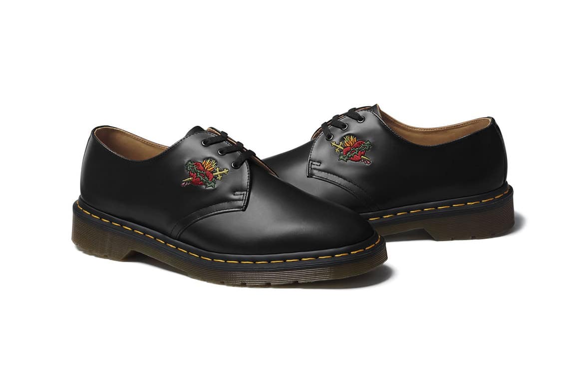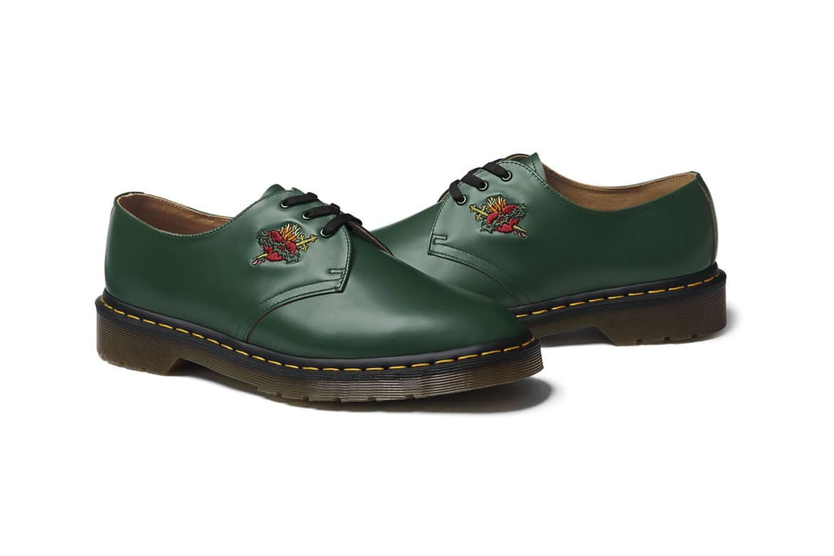 Supreme has once again collaborated with classic boot maker Dr. Martens on a set of fresh new kicks, this time embroidered with a dope Sacred Heart emblem. In three subtle colorways the shoes come in black, oxblood and green.