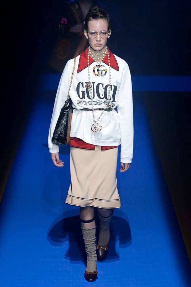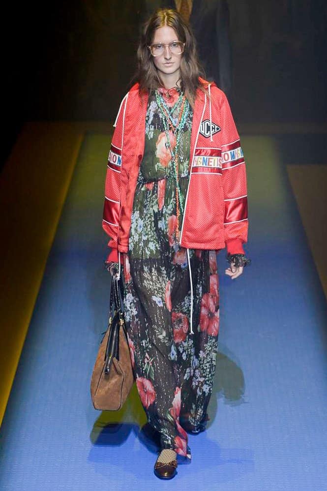 Tracksuits, glamoured up dresses, embellished vests and silky shorts all made appearances on the runway. Gucci’s signature style of bold graphics was employed and the likes of the world famous and instantly recognizable characters Bugs Bunny, Snow White were printed onto sweaters. Also referencing Evil Knievel, a stuntman getup appeared evoking the legendary daredevil. A Marlboro cigarette inspired logo sweatshirt further proved Michele is an expert at creating name brand graphical goodness. Refrencing both the 70’s disco and 80’s era, the silhouettes and colors seen were decidedly vintage. Ostentatious accessories were designated to most looks, big shades and chunky necklaces showed out.