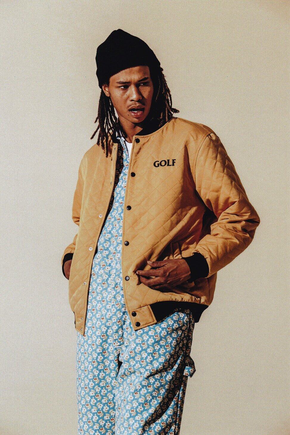 Quarter zip shirts, printed tees and patterned blazers are just some of the clothing items apart of the collection. A tracksuit is decked out with stars down the side of the sleeves and pant legs while a pink furry pair of shorts matches a beanie made of the same fabric. GOLF logos decorate a majority of the clothing. A beige bomber jacket is perfect for the colder temperatures.