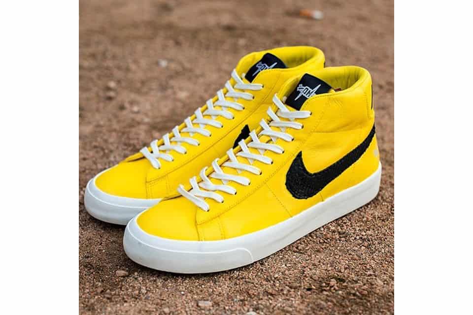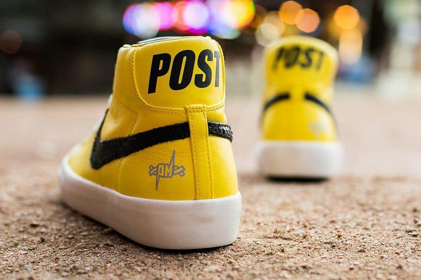Post Malone is at the top of the charts with his 21 Savage featuring hit “Rockstar” and sneaker customizer Jake Danklefs decided to honor the single with a pair of kicks. A highlighter yellow pair of custom Nike SB Blazer Mids was created, featuring a black python leather textured Swoosh. A clean white midsole gives way to a gum outsole.