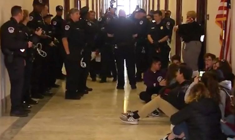A group of about one dozen DC-area high school and college students sat-in on McConnell’s office in the Russell Senate office building, blocking access to his office for about fifteen minutes before Capitol Police cleared the area and arrested eight people engaging in civil disobedience following orders to disperse.