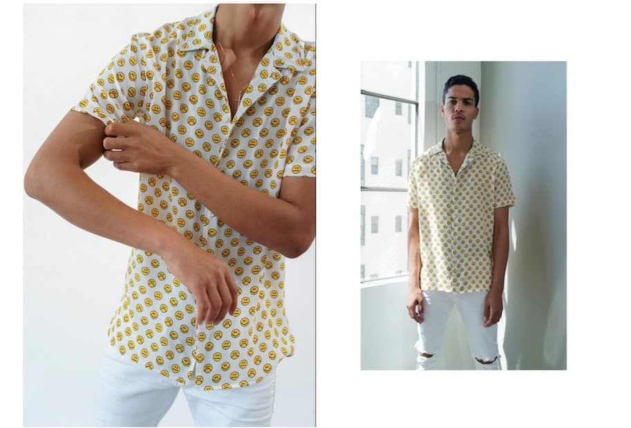 I started designing [the collection] around the idea of this weirdo character. The smiley face shirt came from the different emotions of people — there’s a happy face, a straight face, and a sad face all over. I think I had seen an old vintage polka dot shirt and thought, “Oh, that would be dope if those polka dots were smiley faces!” I went and found some people who did custom-printed fabric, and that’s where things gets technical. We had to design the textile and send it in, but because we do everything in L.A. it can be a little more expensive. On the other hand, we get to see the best quality stuff other than if you’re in Paris or Italy. If anything we match [the quality], because we pay attention to every little thing you can imagine. The inside of our garments are just as clean and put-together as what you see on the outside. It can be something like the shirts being all piped on the inside and open seams.