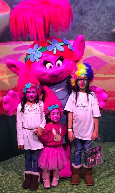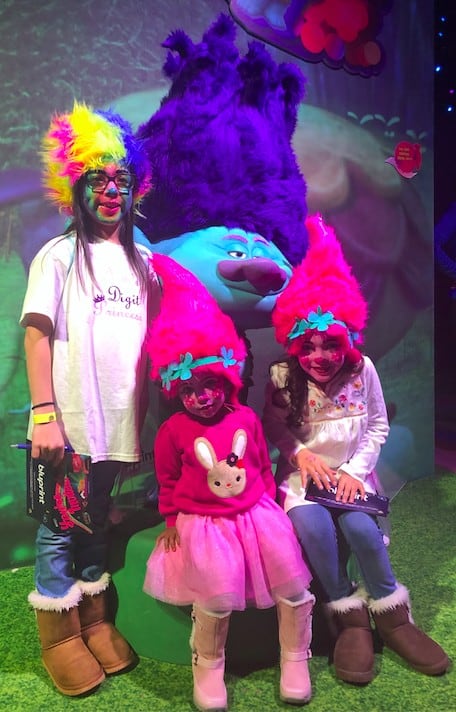 Upon entering the magical rainbow-floored entrance to the best day ever, our hosts guided us to the ‘Hair We Go’ Salon where the kids were transformed into real life troll dolls. Complete with makeup and an uber cool troll wig of choice, the flower-shaped vanity stations made the girls feel like movie stars. Off to complete our journey with map in tow, we were ready to jump into our new adventure. ‘Branch’s Musical Mashup’ did not disappoint featuring a musical interactive room for the kids to press buttons to make music. Next the girls stopped to take pictures with the troll characters Satin and Chenille. Ready for ‘Sparkle on Caterbus’, the mini school bus sprayed us with sparkles that we wee prompted to catch with our bare hands.