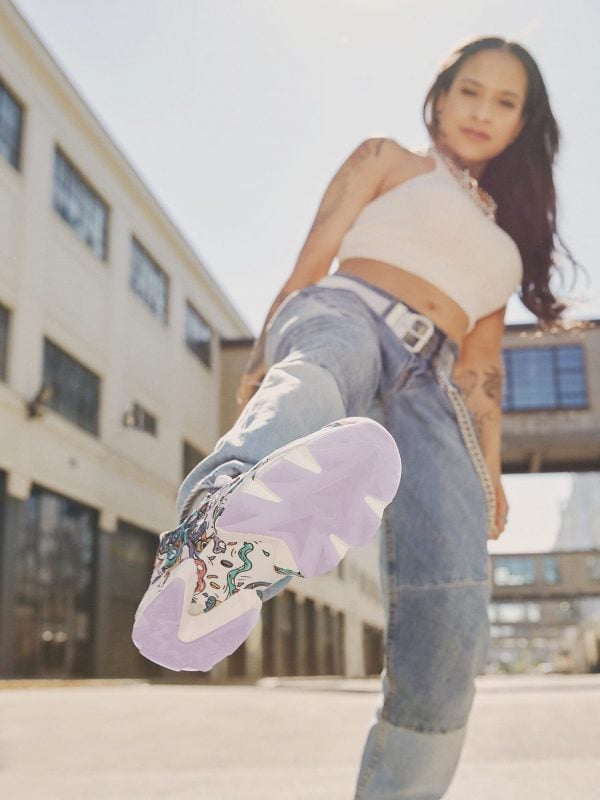 The white, light pink and black shoes feature a mix of grafitti-style pastel illustrations inspired by skate culture, street art and her favorite childhood cartoons. A soft textile upper offers a comfortable feel, and the iconic Pump adjusts the fit for old school cool. The ice outside also adds style points, as well as Distortedd’s signature swirl graphic stamped on the tongue button. The kicks are also unisex!