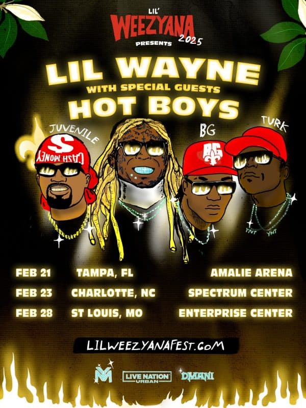 Live Nation Urban has announced an exclusive three-show mini-tour headlined by Lil Wayne, featuring special guests Hot Boys members B.G., Juvenile, and Turk. Presented by Lil’ WeezyAna, the performances will kick off in Tampa, FL, on February 21, followed by a stop in Charlotte, NC, on February 23, and conclude in St. Louis, MO, on February 28.