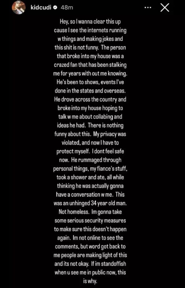 “Hey, so I wanna clear this up cause I see this internets running w things and making jokes and this sh*t not funny,” he wrote. “The person that broke into my house was a crazed fan that has been stalking me for years without me knowing.” Cudi explained that the man had attended his shows and events both in the U.S. and abroad, and had even traveled across the country to break into his home. “He drove across the country and broke into my house hoping to talk w me about collabing and ideas he had,” the rapper continued.