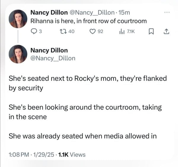 Amid the legal battle, ASAP Rocky has had unwavering support from his loved ones. According to Rolling Stone’s Nancy Dillon, Rihanna was seated in the courtroom’s front row alongside Rocky’s mother, Renee Black. Dillon also noted that Rihanna kept her head down and appeared emotional throughout the proceedings.