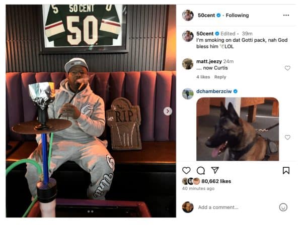 Taking to the Gram, 50 Cent shared a provocative post featuring himself lounging on a couch while smoking hookah, with a tombstone beside him that read “RIP.” In the caption, the rapper wrote, “I’m smoking on dat Gotti pack” before adding, “nah God bless him LOL,” a comment that quickly drew attention for its tone.