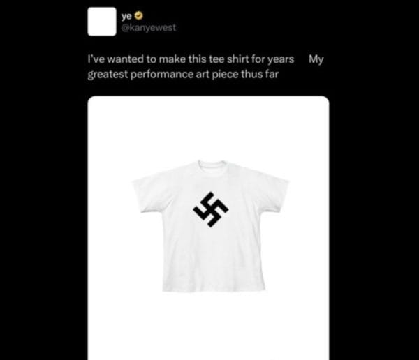 Early this morning, West escalated his antics by sharing an image of a T-shirt featuring a swastika, a symbol synonymous with hate and oppression. Alongside the image, he boasted, “I’ve wanted to make this tee shirt for years. My greatest performance art piece thus far.” The post, which quickly went viral, was met with widespread backlash, with many condemning his apparent attempt to normalize or exploit hateful imagery under the guise of artistic expression.