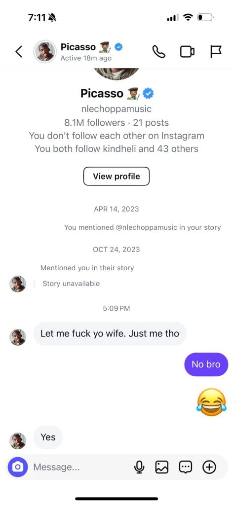 NLE Choppa made a bold move last night, sliding into Adam22’s Instagram DMs with an unexpected request—asking if he could spend the night with Lena The Plug, Adam’s wife.