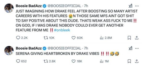 “Serena giving heartbroken by Drake vibes [laughing emojis],” Boosie posted. He followed it up with a criticism of how artists who’ve benefitted from Drake’s collaborations have failed to speak positively about him, saying, “Just imagining how Drake feels after boosting so many artist careers with his features, and those same people don’t have anything nice to say. That’s weak as heck to me.”