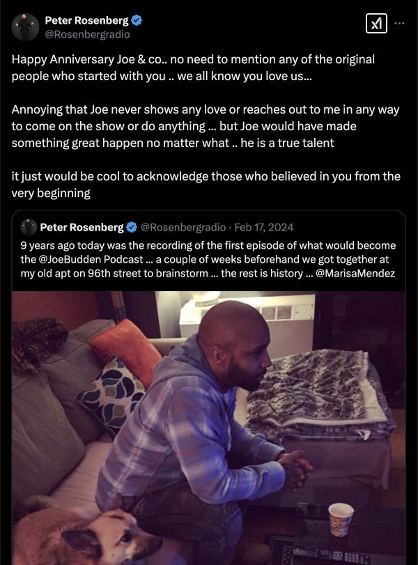 Quote-tweeting a 2024 post that marked the podcast’s ninth anniversary, Rosenberg reflected on its historic first episode while also airing his grievances. “Happy Anniversary Joe & co.. no need to mention any of the original people who started with you,” he wrote sarcastically. “We all know you love us.”
