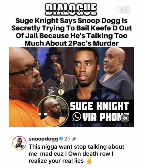 In an interview with The Art of Dialogue, Suge Knight, currently serving time for manslaughter, claimed that Snoop, along with others, had been working behind the scenes to get Keefe D out of jail because he was “talking too much.” He also dragged Snoop into Diddy’s ongoing sex trafficking allegations and accused him of lying about visiting 2Pac in the hospital before his death.