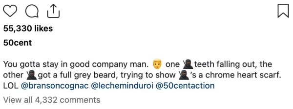 “You gotta stay in good company man,” the G-Unit rapper wrote in his caption, adding, “One [ninja emoji] teeth falling out, the other [ninja emoji] got a full grey beard, trying to show [ninja emoji]’s a chrome heart scarf.”
