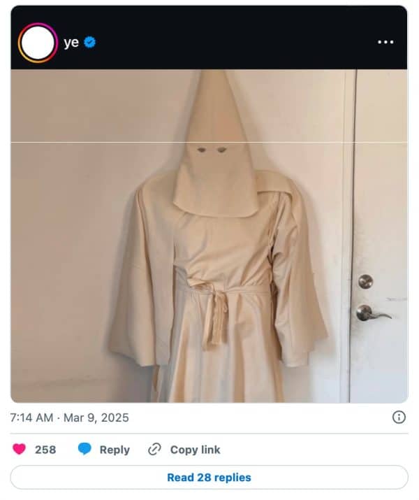 Shortly after teasing the choir’s return, he shared a now-removed photo of a white robe typically associated with the Ku Klux Klan (KKK) on Instagram, captioned “Outfit of the day.” He also posted the same image on X (formerly Twitter) with the caption “FIT PIC.”