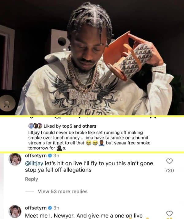 Offset has responded to Lil Tjay’s recent claims about his finances, challenging the Bronx rapper to settle their differences in person.