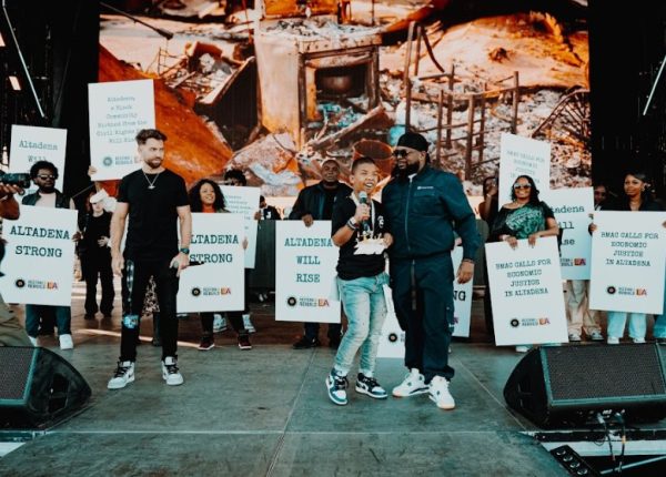 During an emotional moment on stage, BMAC CEO & President Willie “Prophet” Stiggers joined Rolling Loud Co-CEO Tariq Cherif, dozens of Altadena residents, and 10-year-old fire survivor Grayson Roberts to amplify the community’s struggle. As the crowd chanted “Altadena Strong,” signs reading “Altadena Will Rise” and “BMAC Calls for Economic Justice in Altadena” filled the stage. Roberts shared heartfelt words about his love for his hometown, highlighting the resilience of those affected.