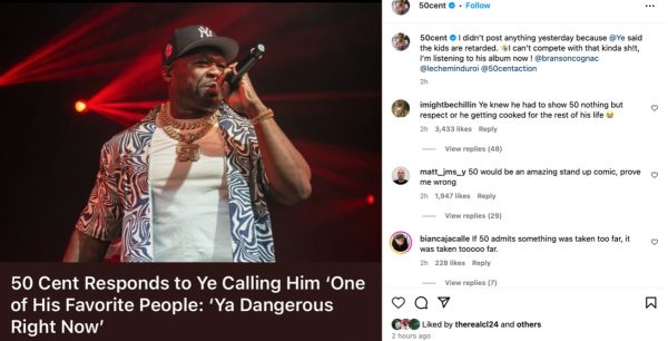 But get this: two days later, 50 Cent returned to Instagram to explain his brief absence from the platform, joking that Ye’s unpredictable behavior had kept him at bay. “I didn’t post anything yesterday because Ye said the kids are retarded. I can’t compete with that kinda sh*t, I’m listening to his album now,” the rapper and entrepreneur quipped, showcasing his ability to address serious topics with humor.