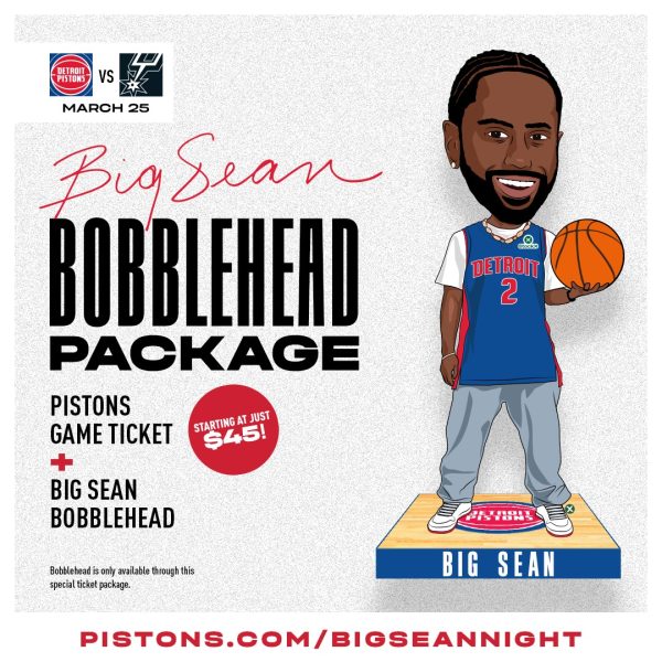 A charitable ticket package includes a game ticket and an exclusive Big Sean bobblehead. Proceeds benefit the Detroit Pistons Foundation and the Boys & Girls Club of Southeastern Michigan through the Sean Anderson Foundation. Tickets are available at Pistons.com/BigSeanNight.