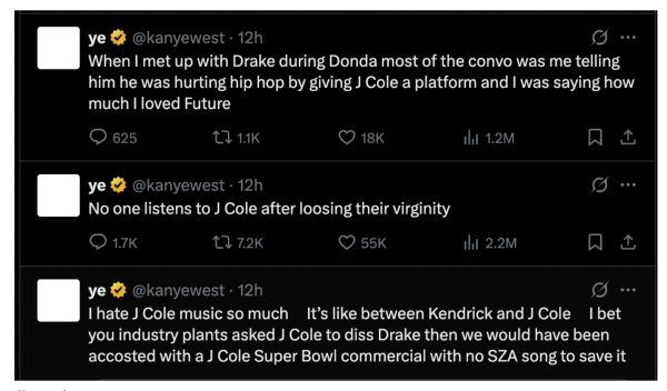 In response to a post highlighting J. Cole’s verse on Benny The Butcher’s “Johnny P’s Caddy,” Ye clarified his stance. “I hate J Cole music so much,” oh, tell us how you really feel, Ye … “It’s like between Kendrick and J Cole I bet you industry plants asked J Cole to diss Drake then we would have been accosted with a J Cole Super Bowl commercial with no SZA song to save it.”