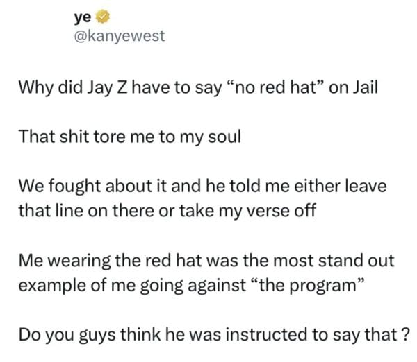 Kanye went a step further, suggesting the bar may have been influenced by something bigger: “Me wearing the red hat was the most stand out example of me going against ‘the program.’ Do you guys think he was instructed to say that?”